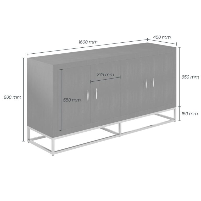Four door black sideboard, faux shagreen, chrome handles and base, handles require attaching, shelving.