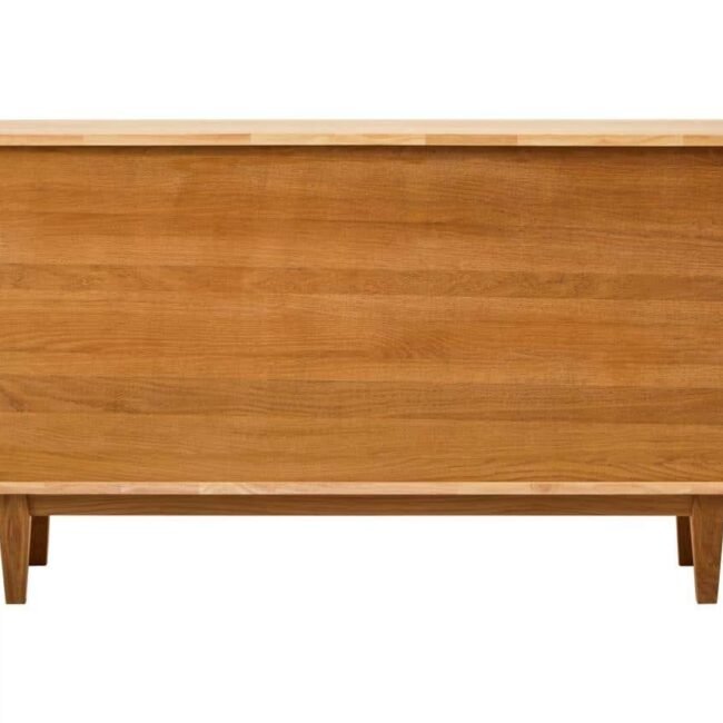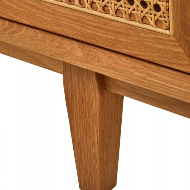 This four door sideboard has a solid oak wood frame with woven rattan front panels exuding contemporary minimalism. Its clean lines and tapered legs add sophistication, while the four spacious compartments provide ample storage.