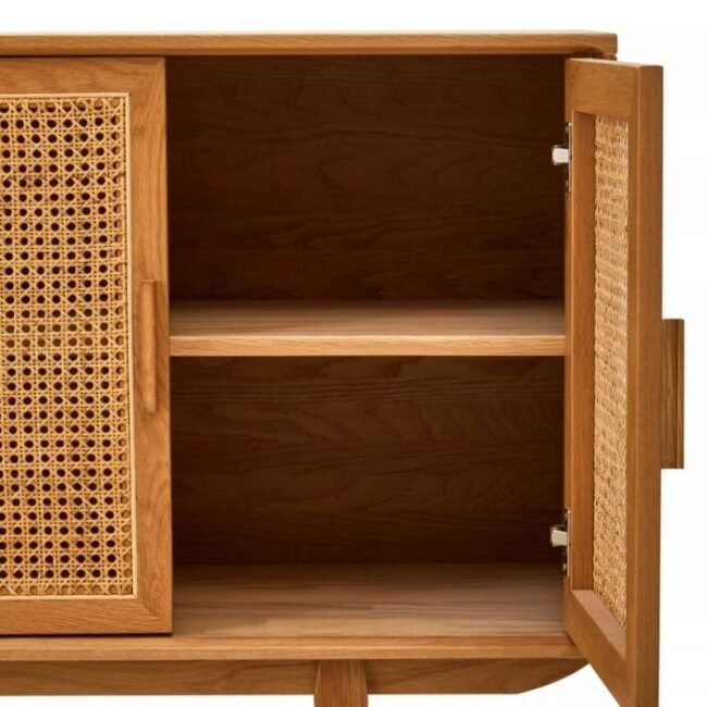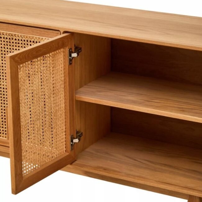 The Hather 4 Door Natural Rattan And Oak Sideboard effortlessly combines rustic charm and sophistication with a durable oak wood frame adorned with natural rattan inserts.