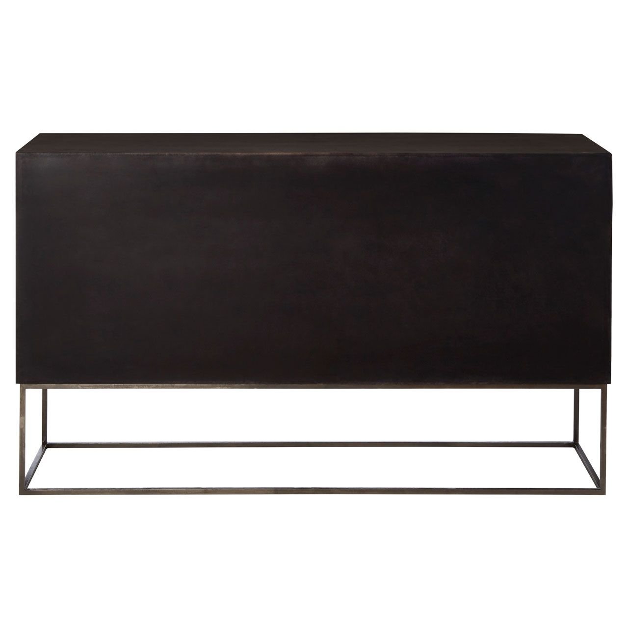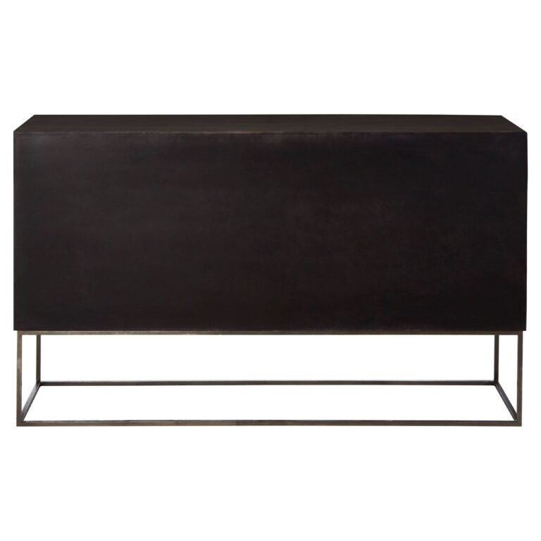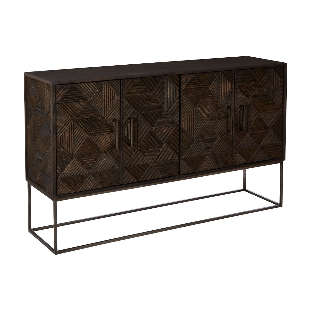 The Irai Sideboard is handcrafted from renewable mango wood. Its four doors are patterned with geometric carvings, and the slim iron handles feature a metallic antique brass finish. The cabinet is supported by angular iron legs. *This item is handcrafted so please expect slight variations to the finish*
