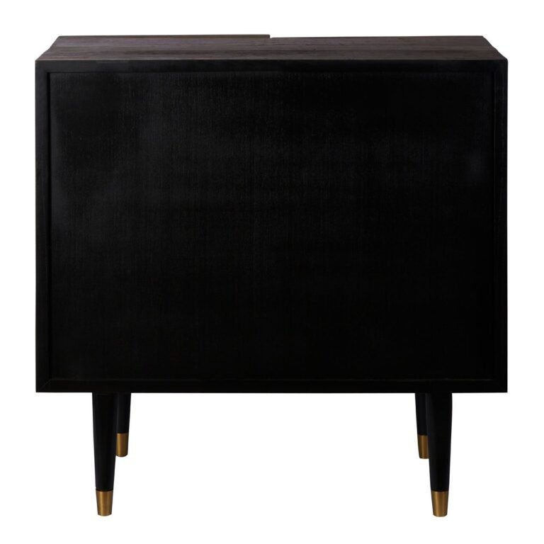 The Layne Natural Sideboard is expertly handcrafted from recycled elm wood and features a carved effect of abstract geometric patterns on the doors. Black finish wooden legs contrast the natural accent of the understated top.