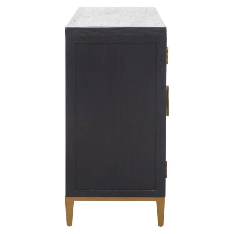 The Minia elm wood sideboard in a black finish with an iron base adds a stylish touch to any room.