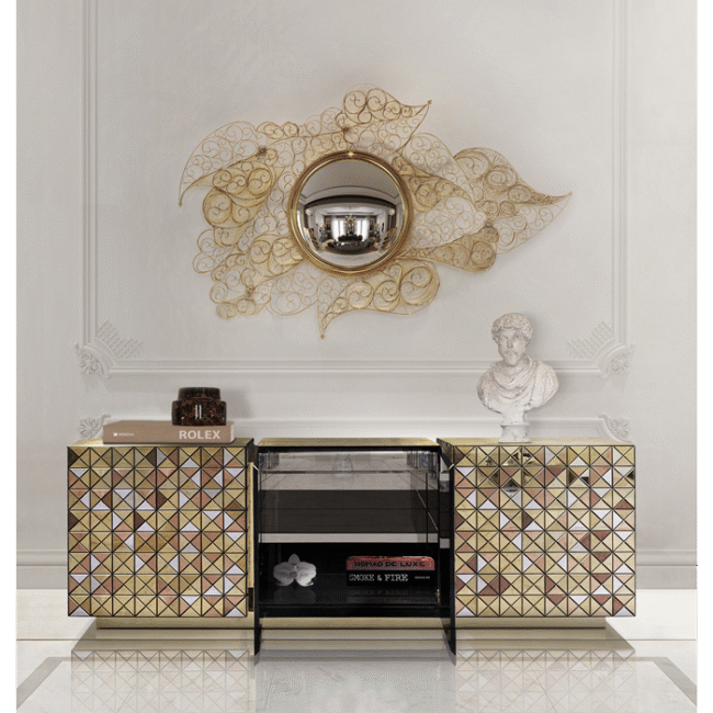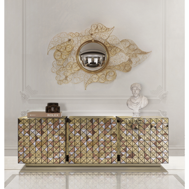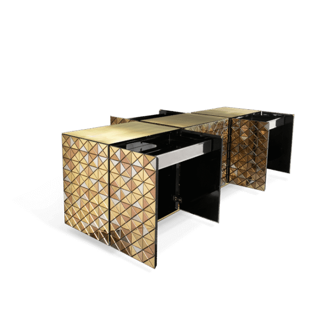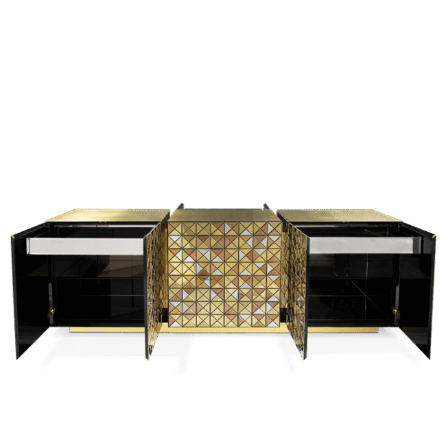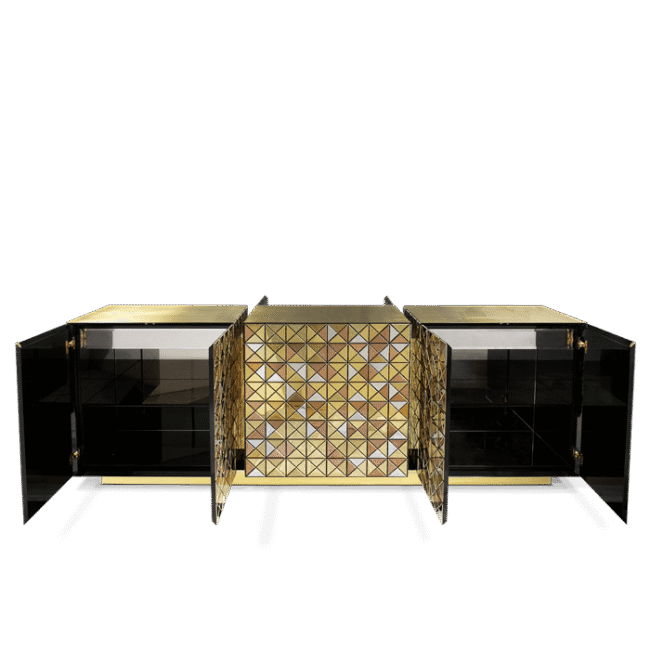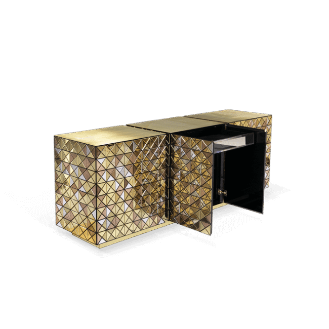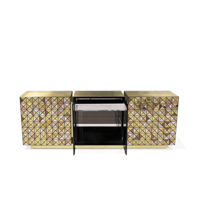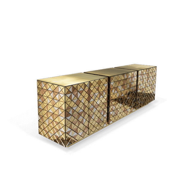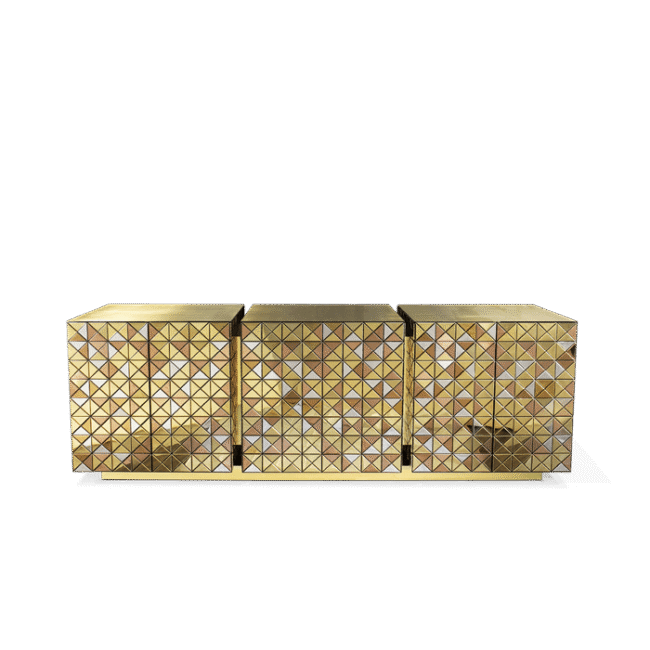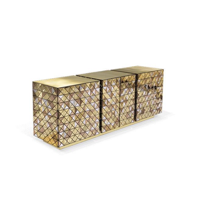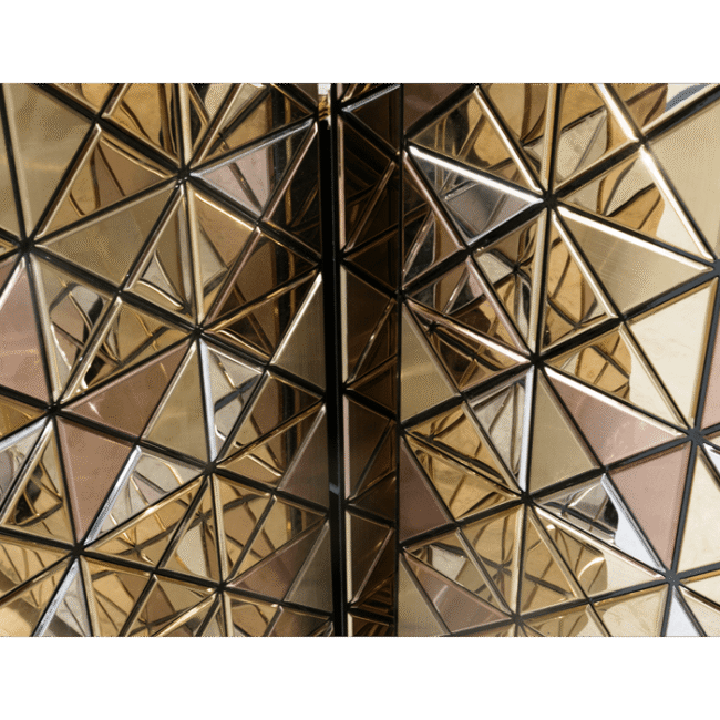Double-sided sideboard with three doors covered by triangles made from anodized aluminum. Different tones of stainless steel in gold, copper and silver; with brushed and polished finishes.