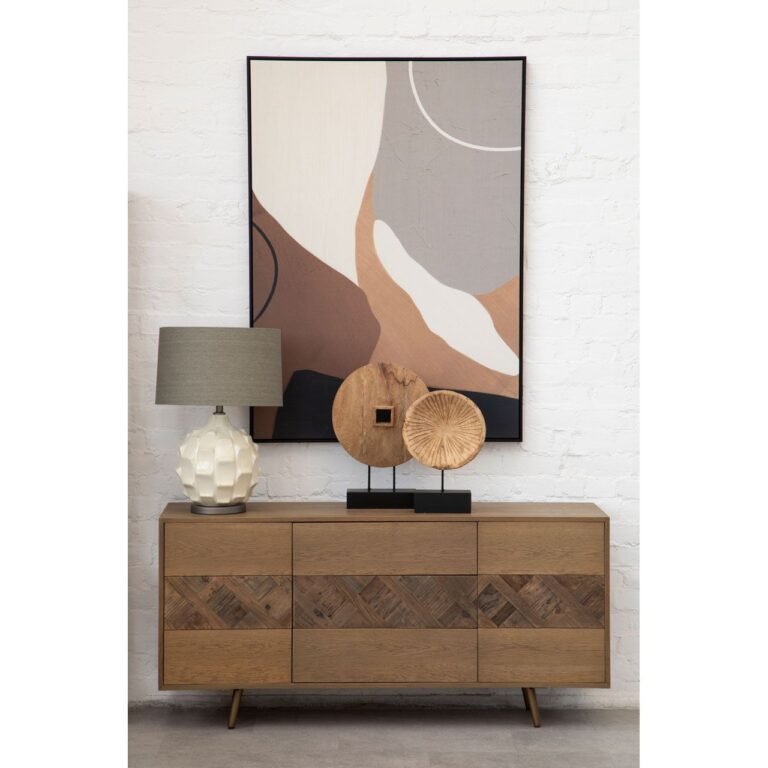 Railver Brown Sideboard: Constructed from a combination of sustainable sourced antique elm wood and oak wood, this sideboard has three doors which open to reveal generous storage space. The rustic outer and texture are complemented with a patterned row on the front which transforms the otherwise understated appeal. Display it as part of an exotic boho design theme.
