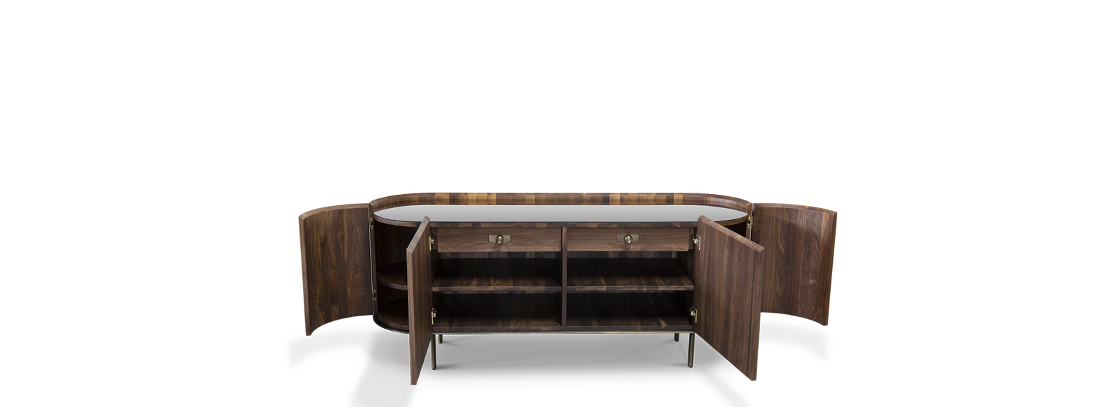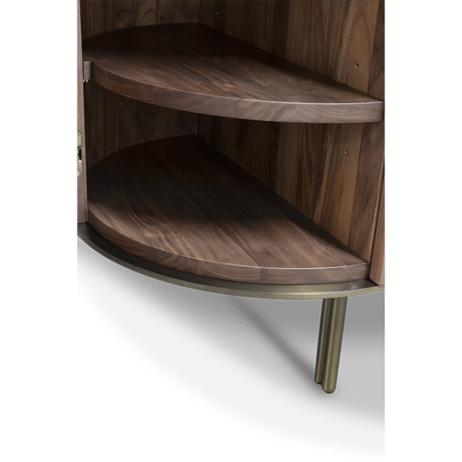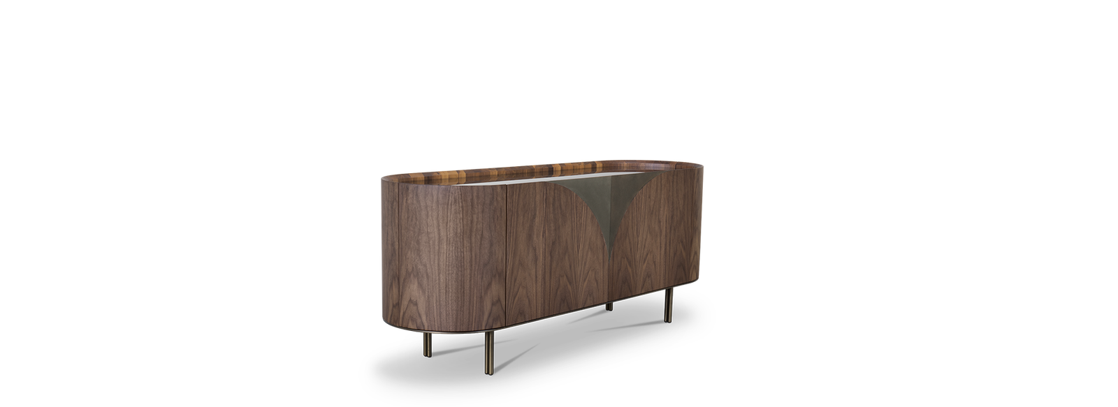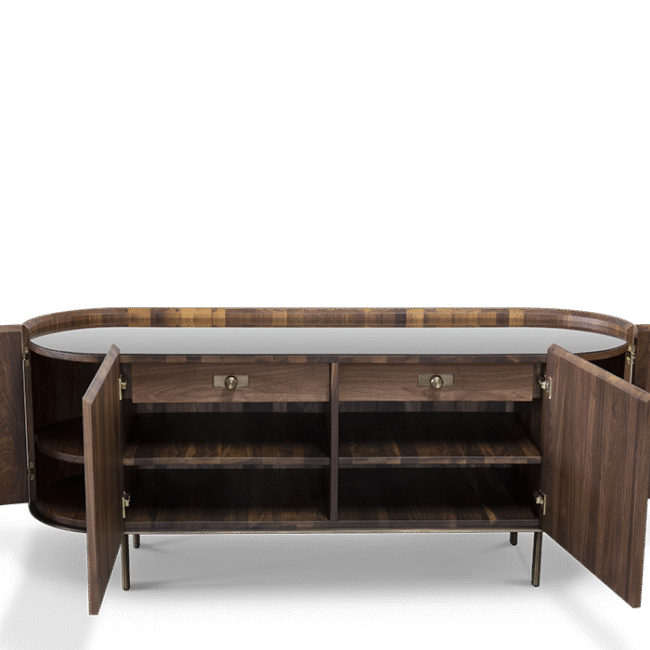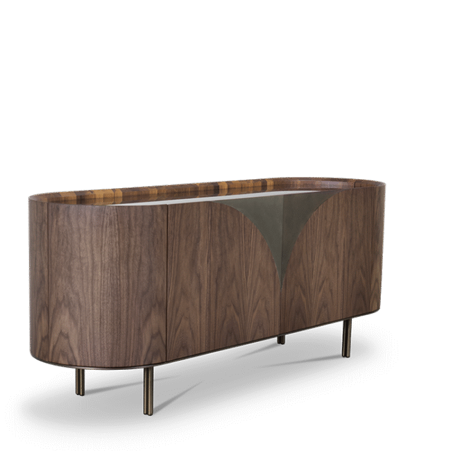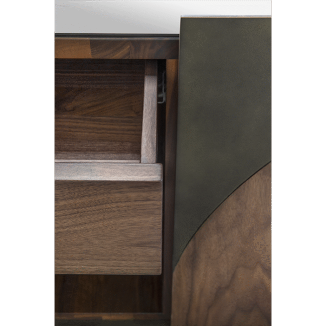 Sulu Sideboard: Modernistic and sophisticated, the triangular epoxy dark bronze shapes on both doors for this modern sideboard, reflect the erupting volcano that formed the Sulu Archipelago, home of the Kahawa Sūg, or Sulu coffee, a variety with a unique origin. This chic sideboard shares a similar creation, a robust rounded walnut veneer matte body with a refined bronze glass top, creating a perfect balance between the materials, without diverging from its inspiration and without compromising its beauty in any room or setting.