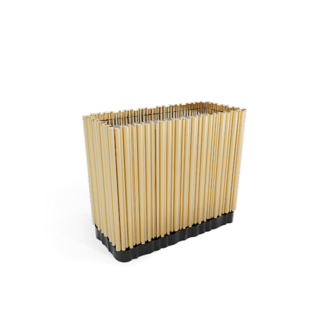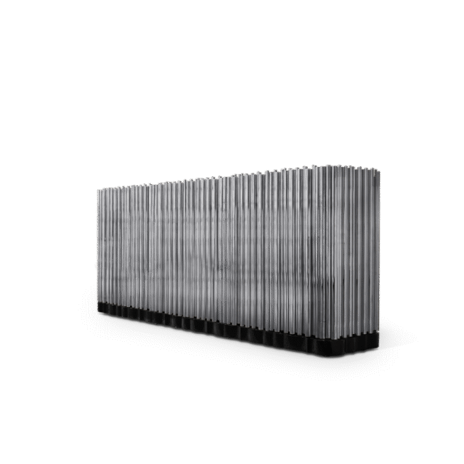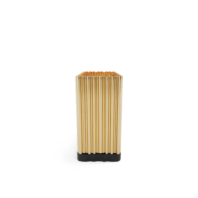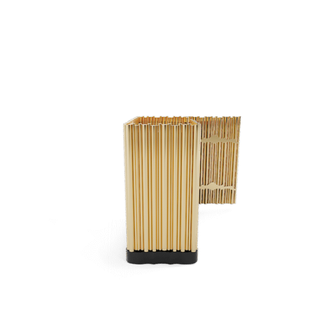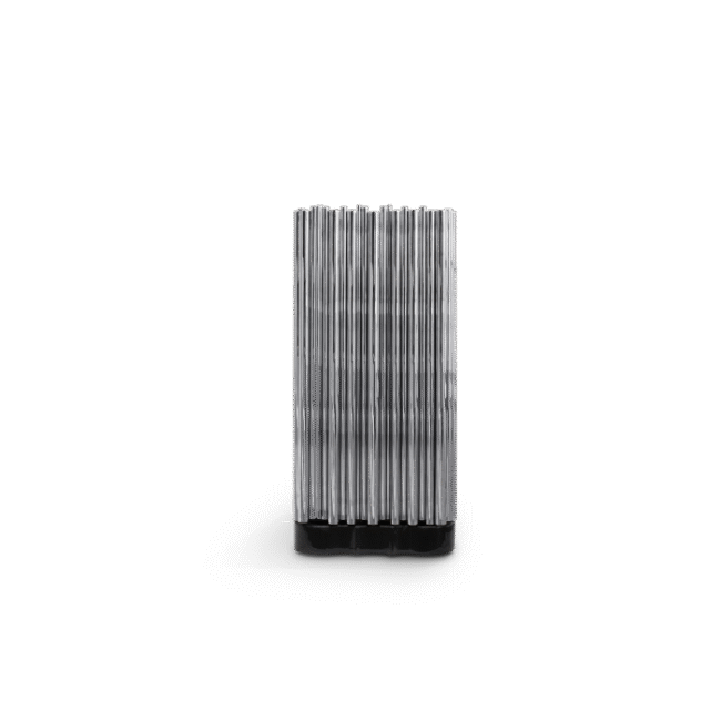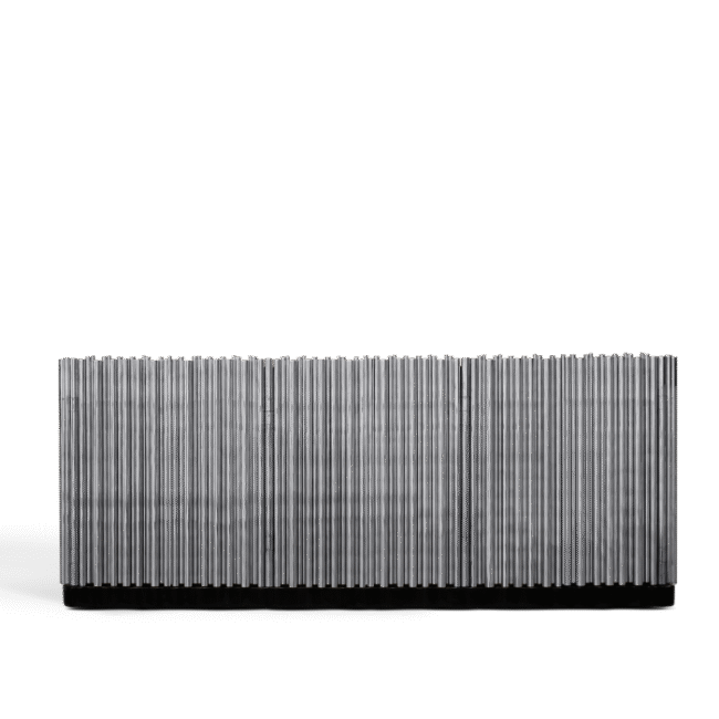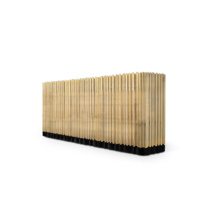 This buffet presents a strong wood body enveloped in a tubular cluster of either gold or nickel plated brass tubes, where each door is carefully welded with cutting edge-technology. A harmonious artful juxtaposition that adds rhythm and sophistication to any space. Symphony is wrapped up by a strong black lacquered base, while the top is finished in opaque black glass.