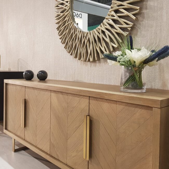 Valencia Sideboard (BDVSD0) Living Room comes in textured natural grey oak in a parquet style design with striking gold handles. The Valencia Sideboard can help achieve the perfect finish in any home or interior design project. This is a stock item and is available for next day dispatch.
