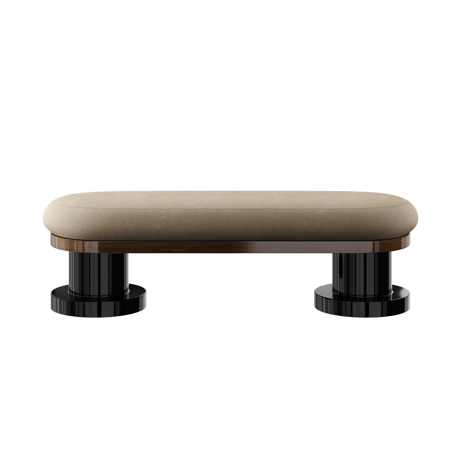 Upholstered in Suede Beige; Structure in Walnut Wood Veneer; Legs in Glossy Black Lacquer