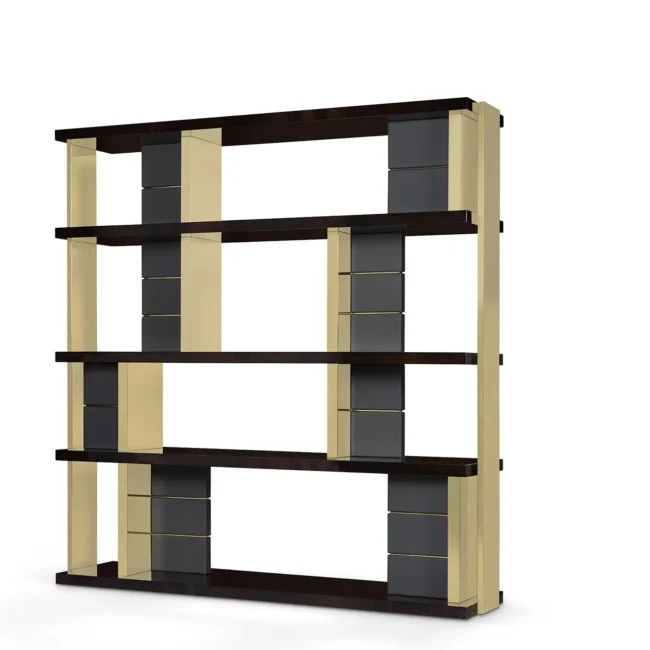 The Lloyd Bookcase is crafted with timeless and subtle lines to complement any interior. This functional yet decorative bookcase will subtly enhance your contemporary and modern office design. This designer bookcase is meticulously crafted using high-end materials such as polished brass, walnut root, and grey leather, ensuring durability and sophistication in every detail.