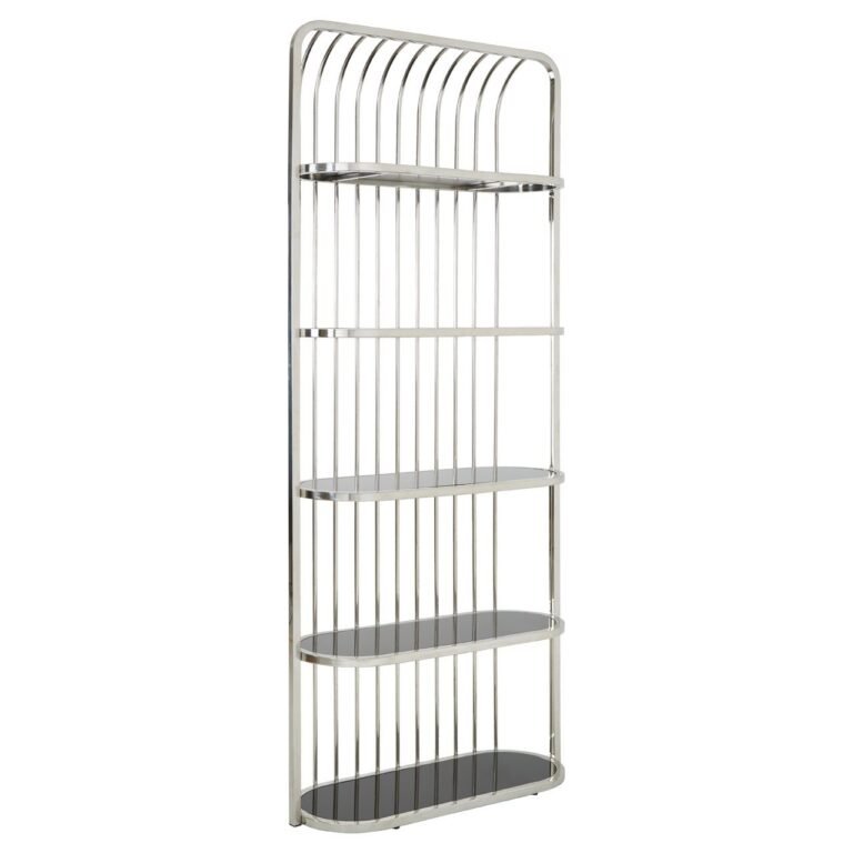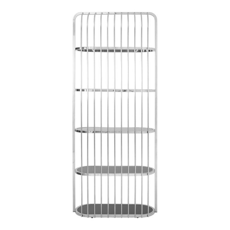 Waver Silver Cage Design Bookshelf: This tall bookcase features slim stainless steel lines that curve at the top to form a hood over the five shelves. Each shelf is made from tempered glass and is coloured black to contrast the silver finish frame.