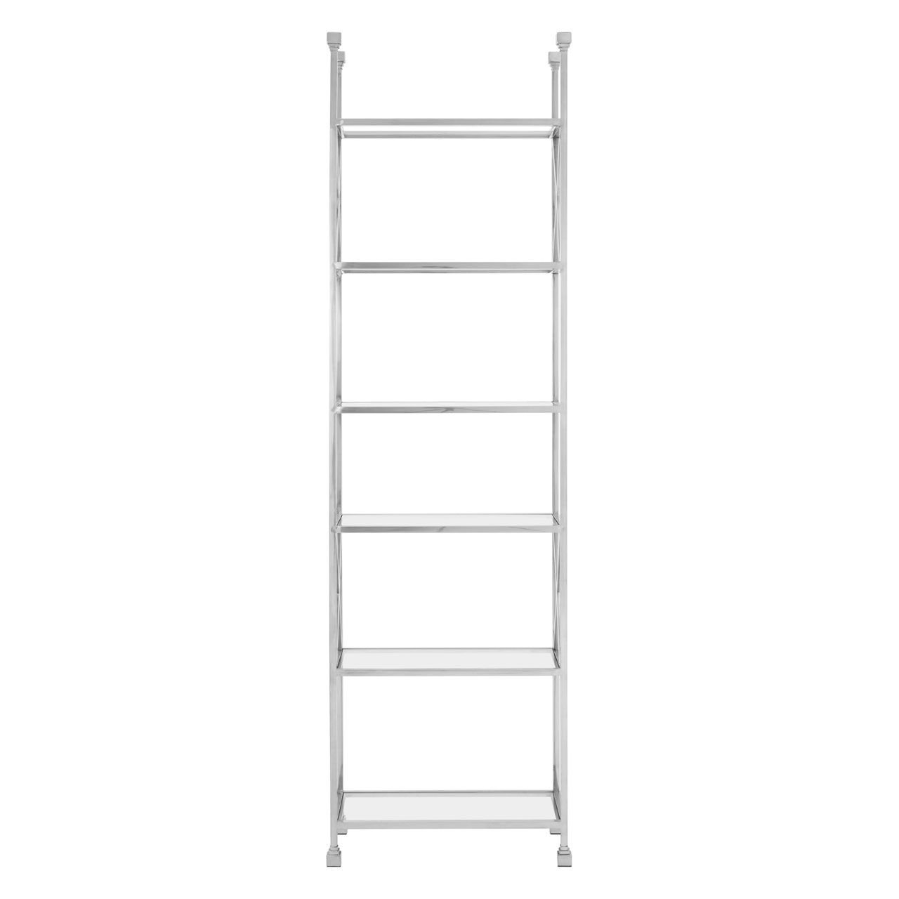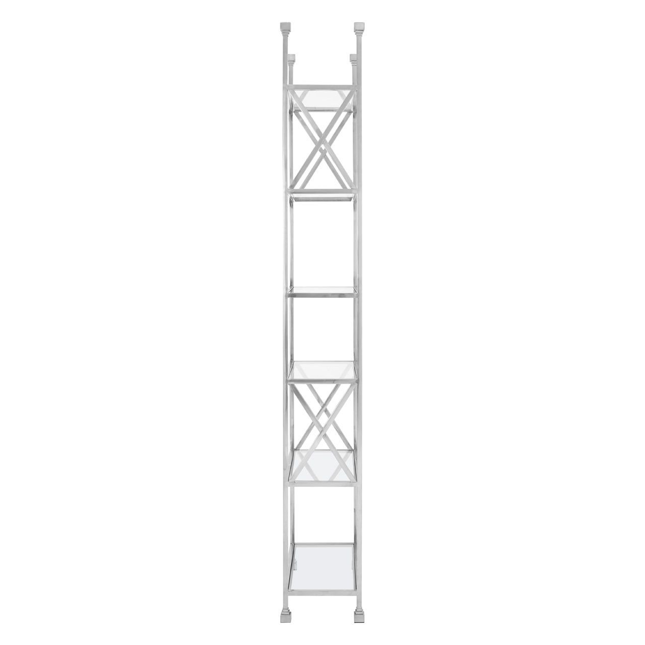 Waver Silver Cross Design Bookshelf: The frame is made from silver finish stainless steel and its sides have a distinctive lattice pattern. Each of the five tempered glass shelves is coloured black to contrast with the sleek and reflective frame.