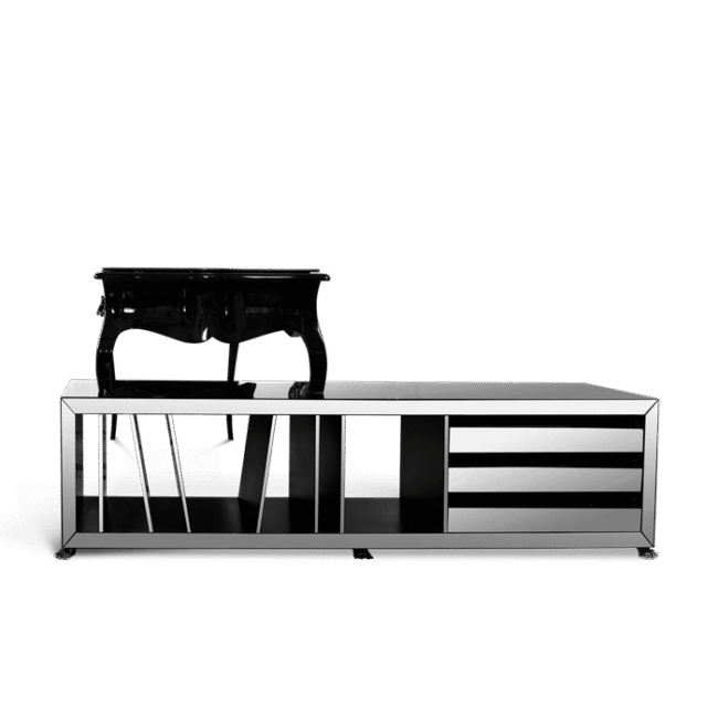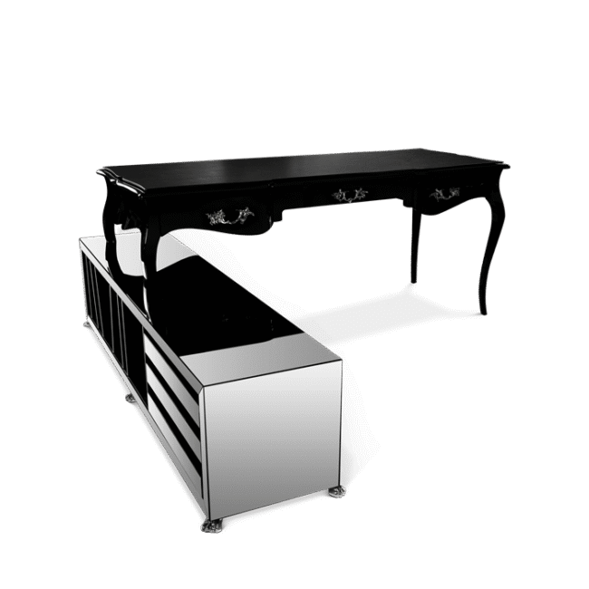 The Boulevard modern desk is a highly desirable classical piece. Perfect for your home office, or for a private space in your modern house, where you wish to register your thoughts and your ideas. Crafted from solid wood, this writing desk features a black leather top and three drawers with a classic cast brass handle finished in black. The attached drawer file unit has ample storage and is covered in a smoked mirror.
