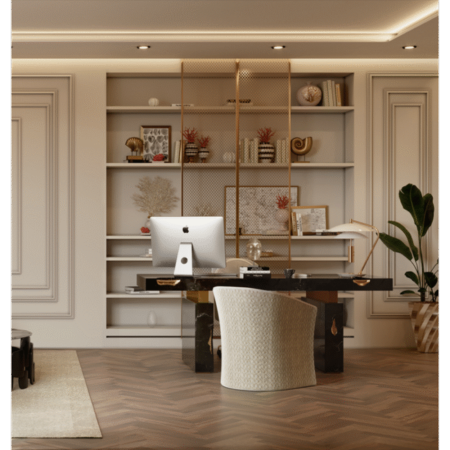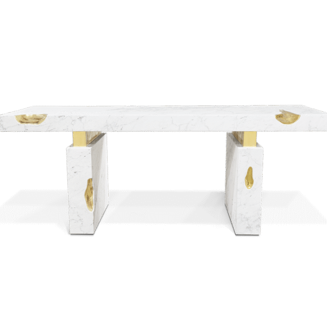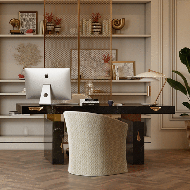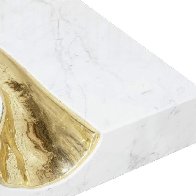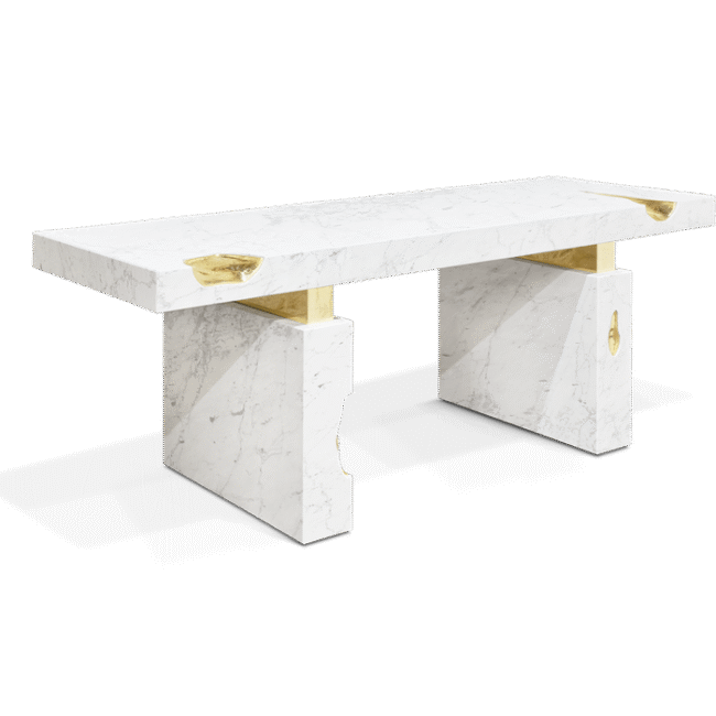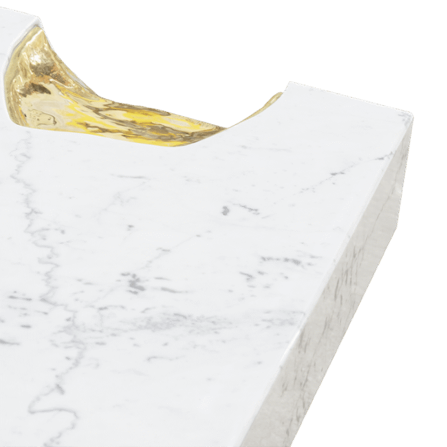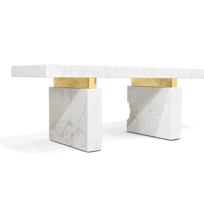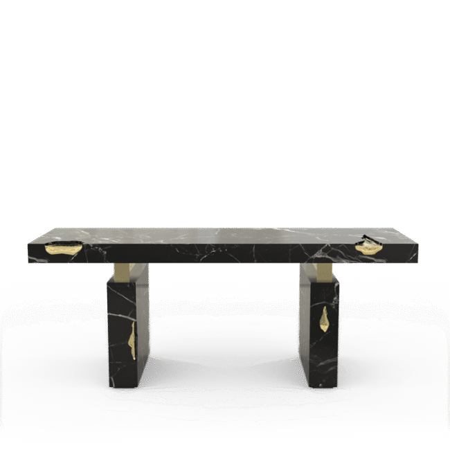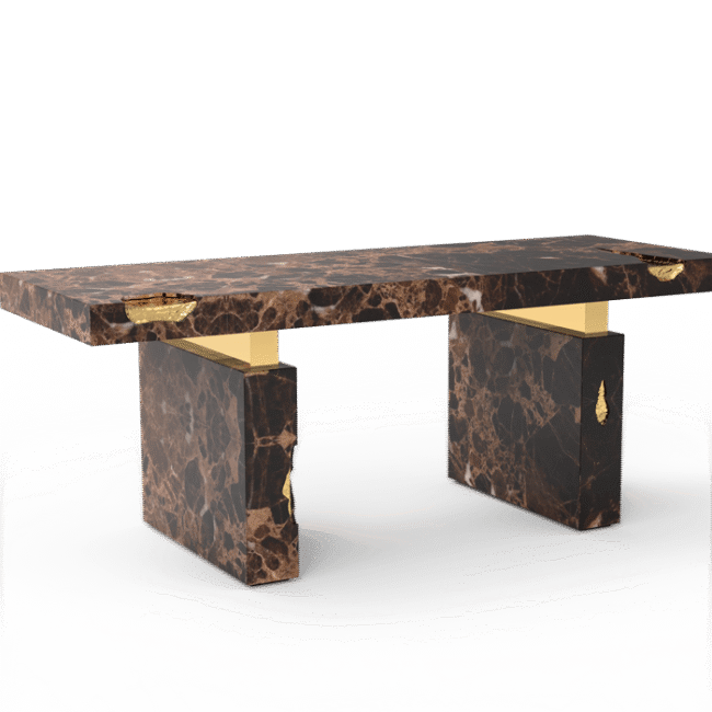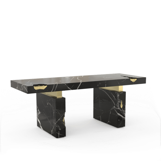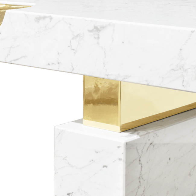 An elegant writing desk built in marble with polished brass details. Its cracks are hand-carved and inserted through polished brass sheets, which are hand-hammered for a unique finish.