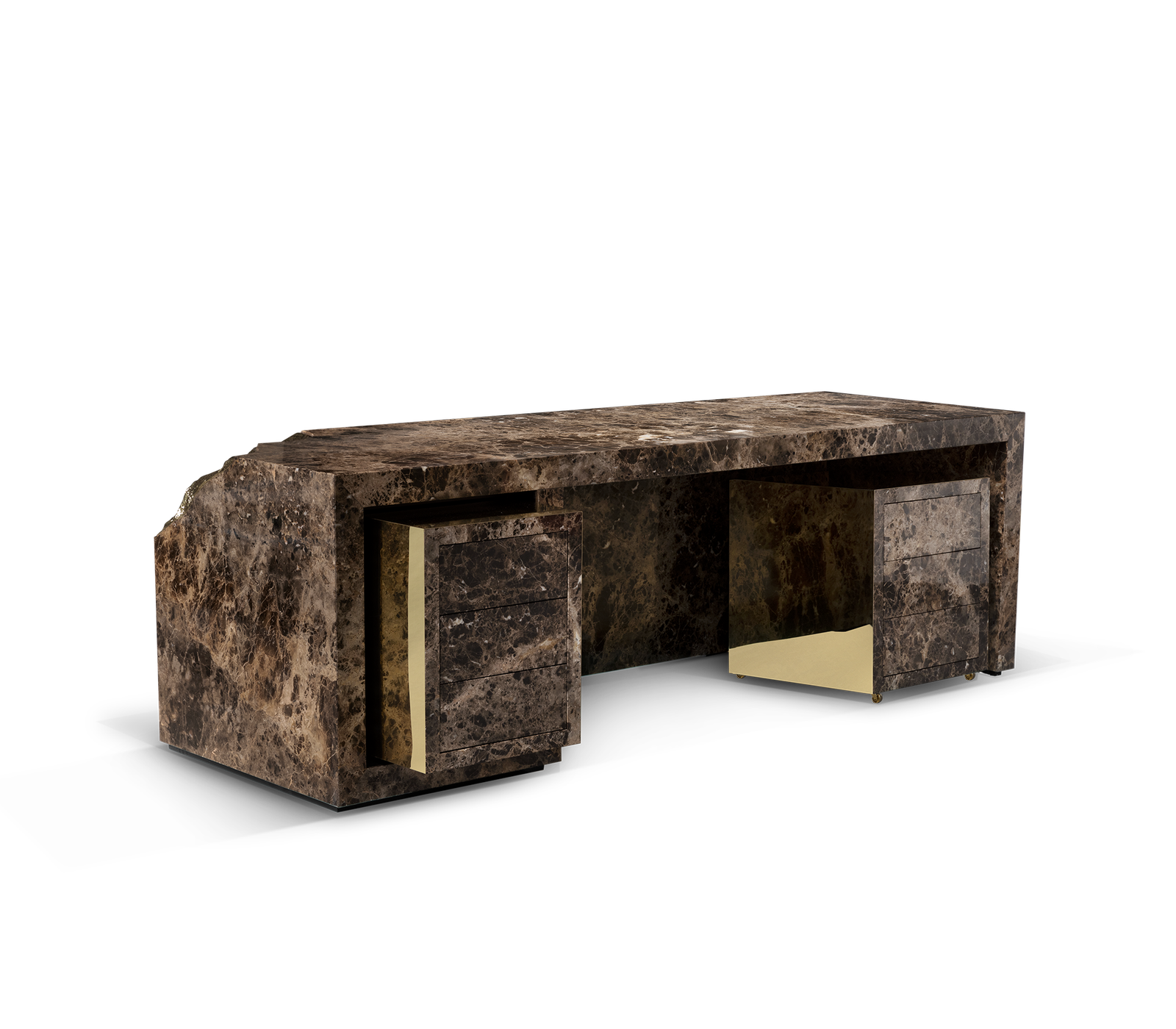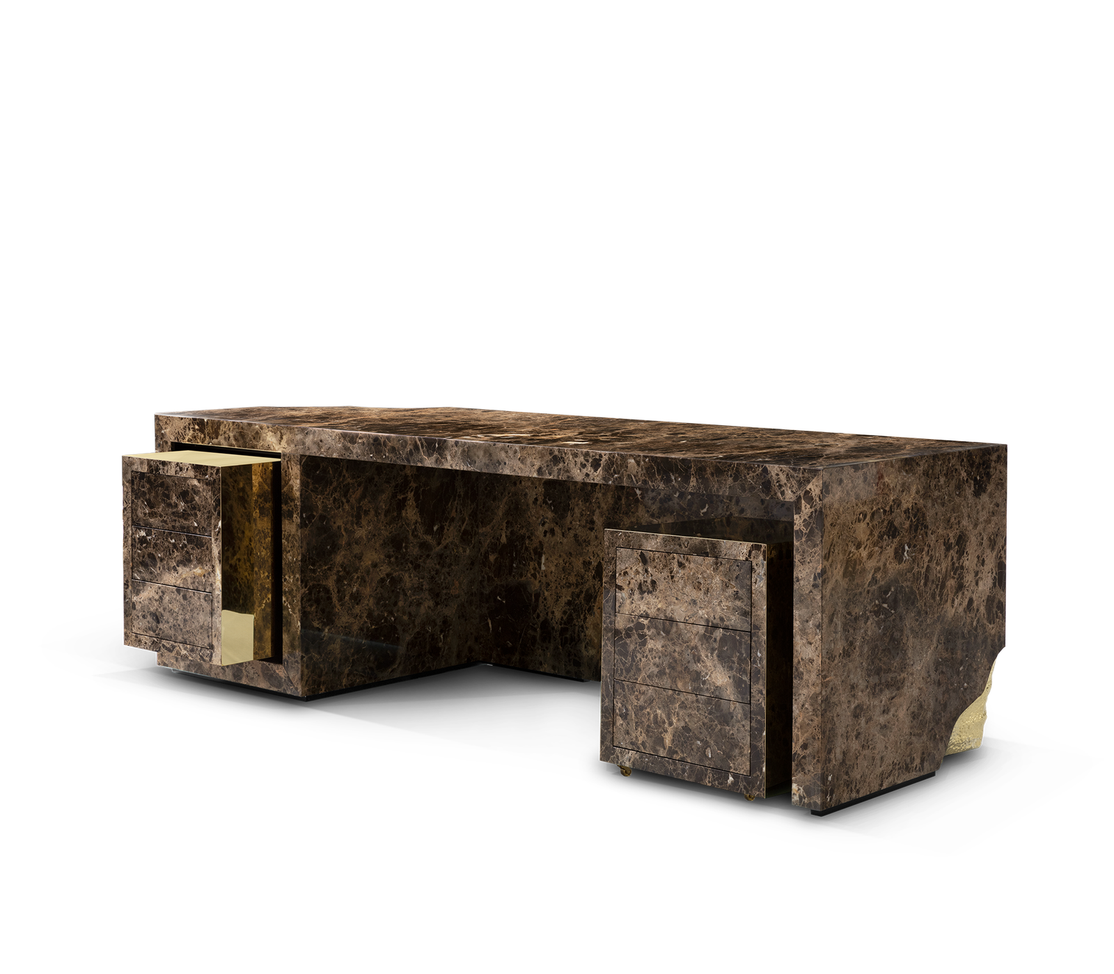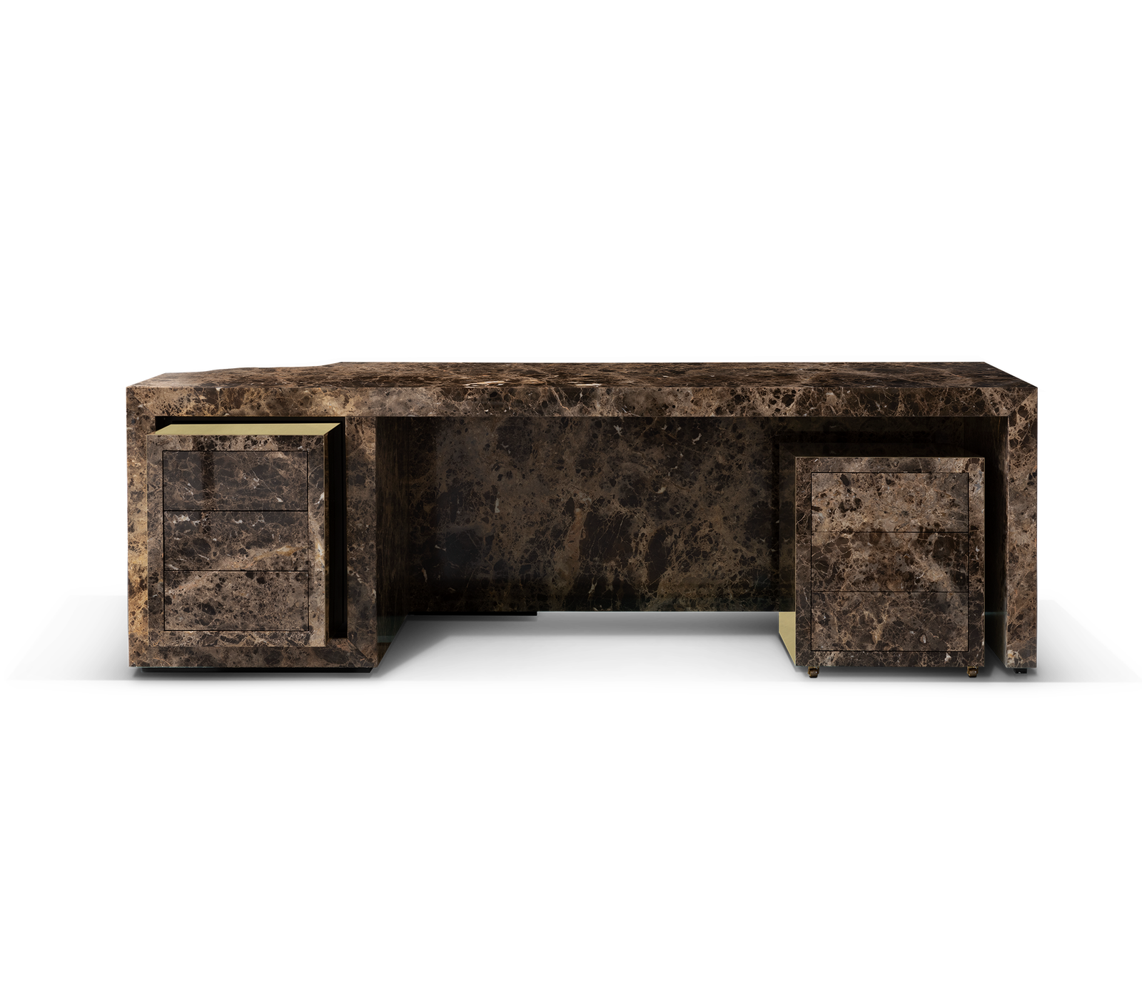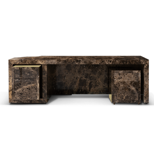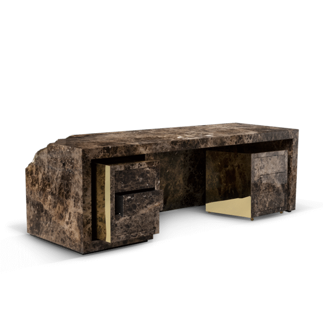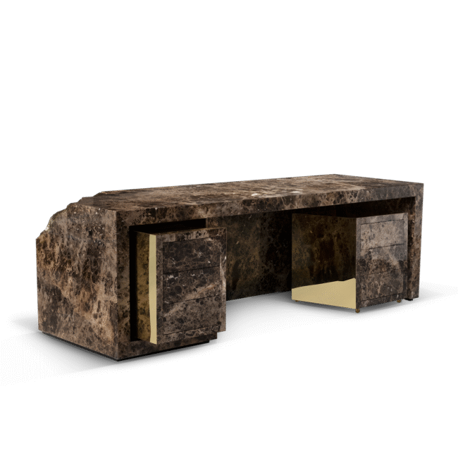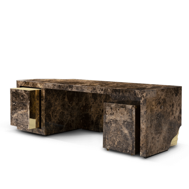 Contemporary writing desk finished in timeless wood veneer and exquisite polished brass surface details. It is composed of three drawers and hidden handles.