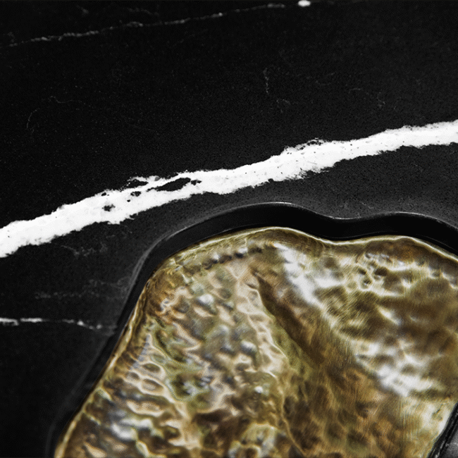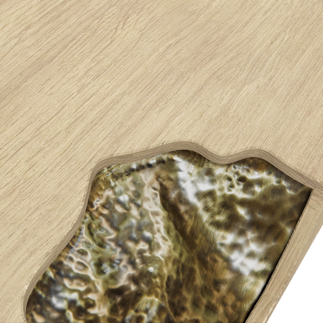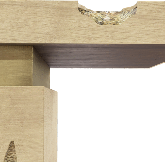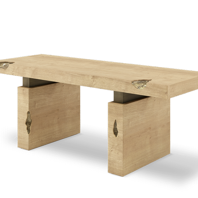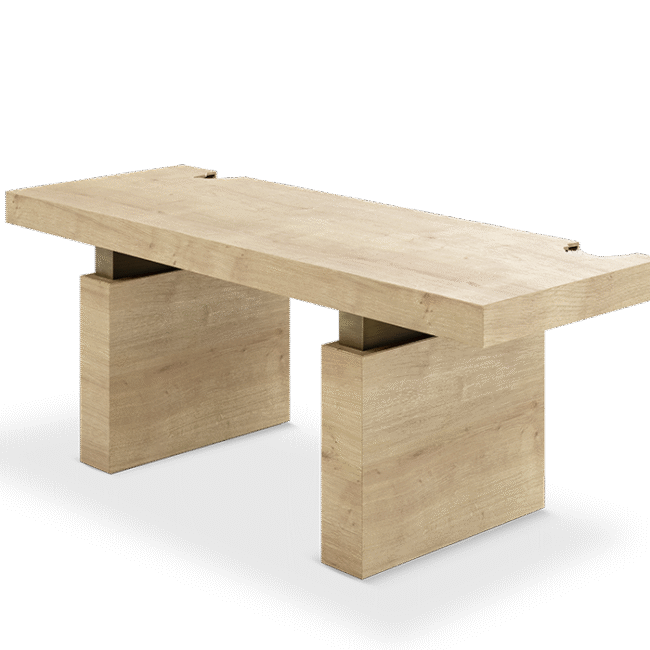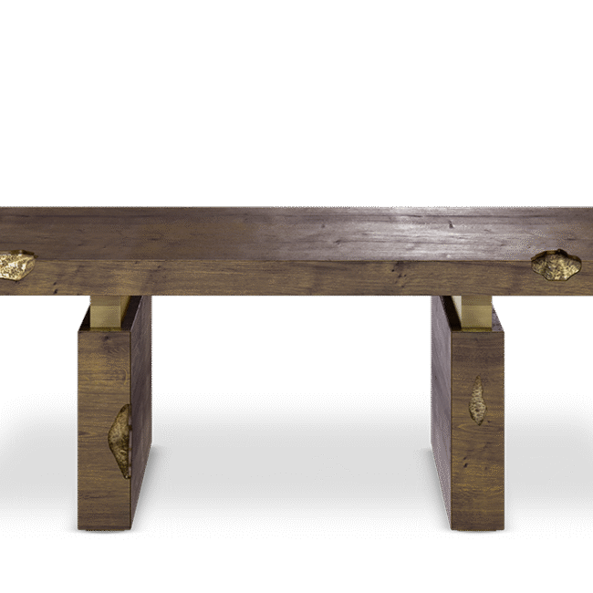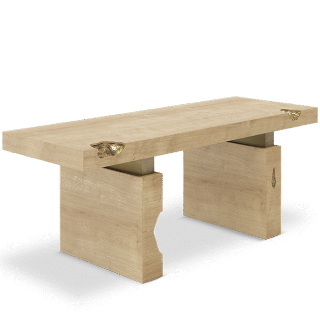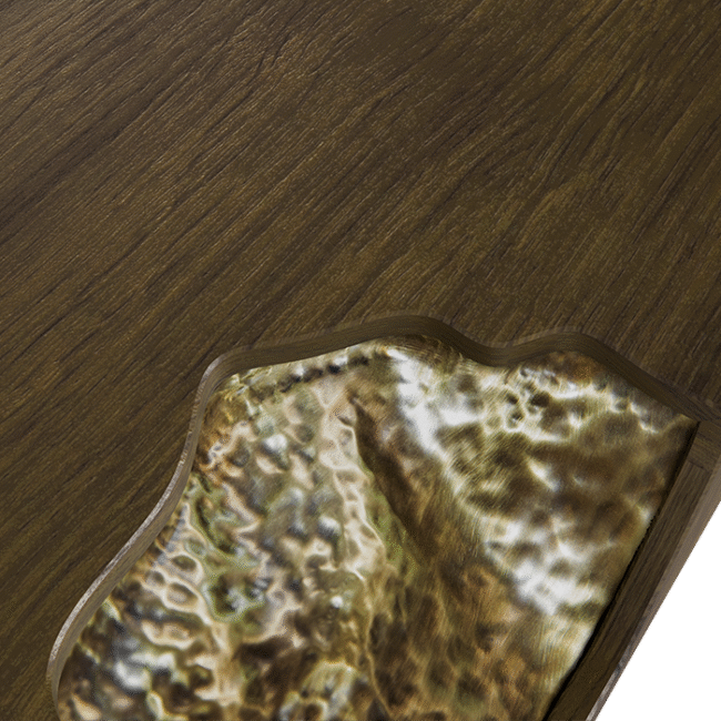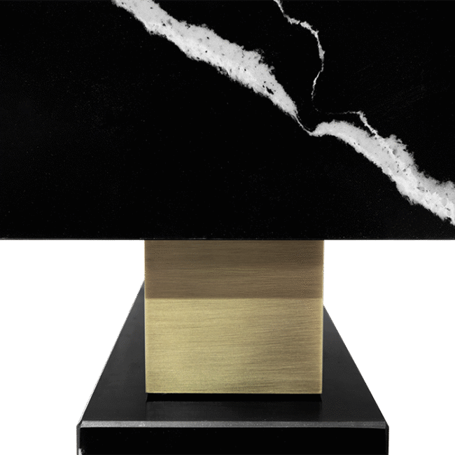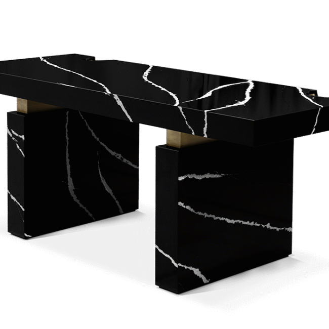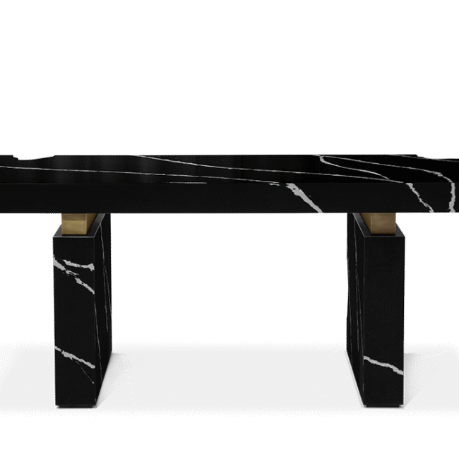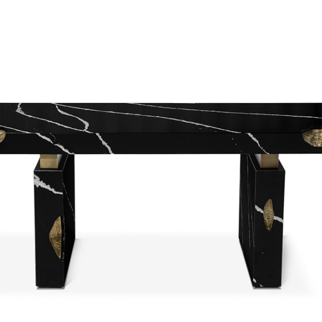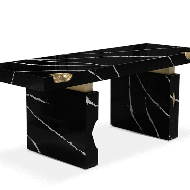 The Nougat desk is inspired by the shape and combination of coffee and chocolate, where the harmonious flavors combine perfectly for an overwhelming taste experience. Fulfilling your cravings for something rich, this high-end desk makes for a deluxe aesthetic the same way chocolate resonates with coffee. The cracks in aged brushed brass over the nero marquina marble in the top and legs, resemble the flavorful almonds emerging from the dark chocolate nougat. A desk to indulge in an elegant and modern office.
