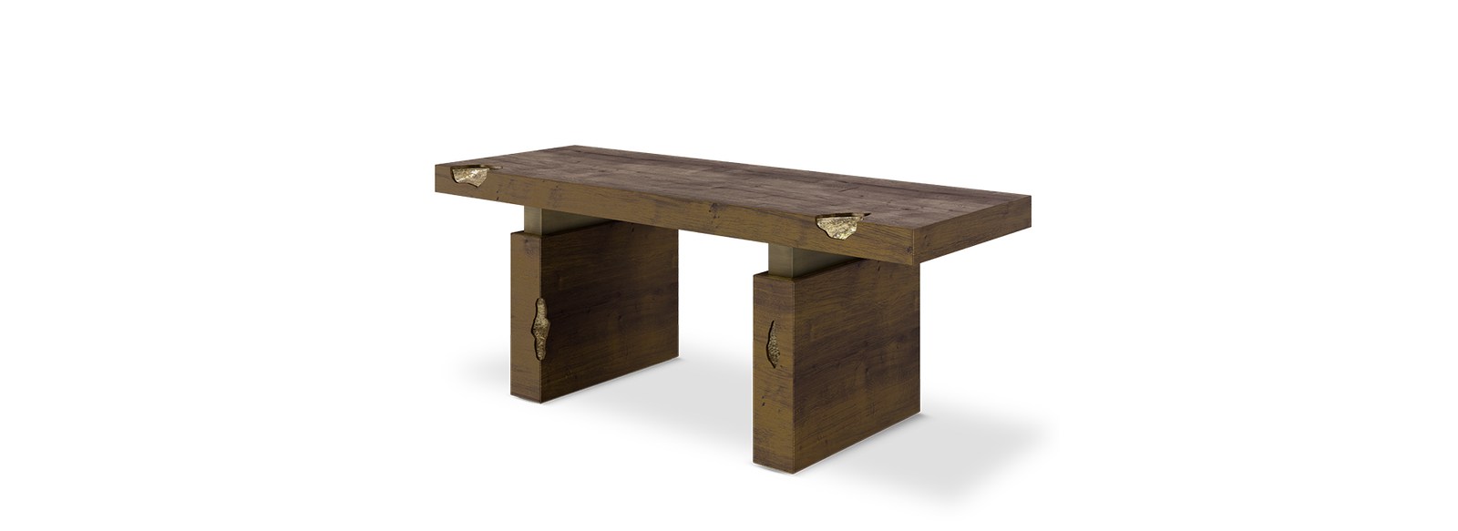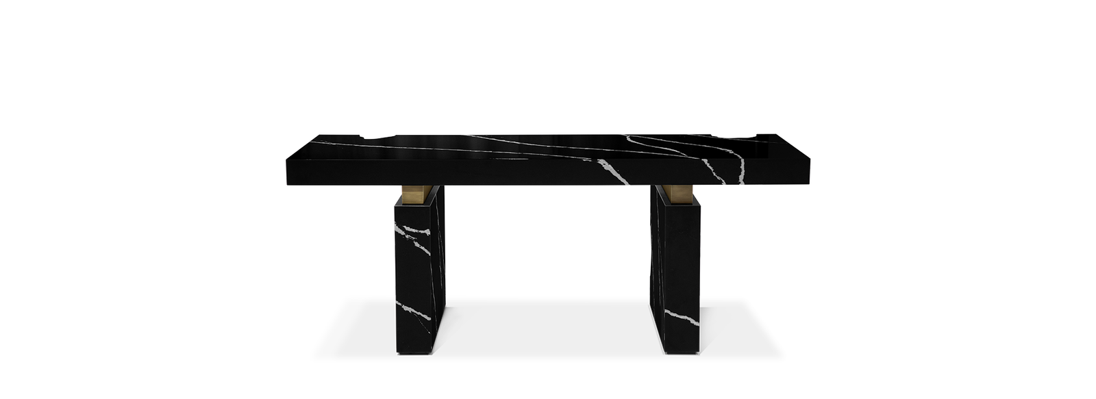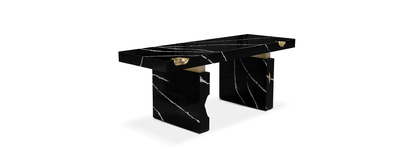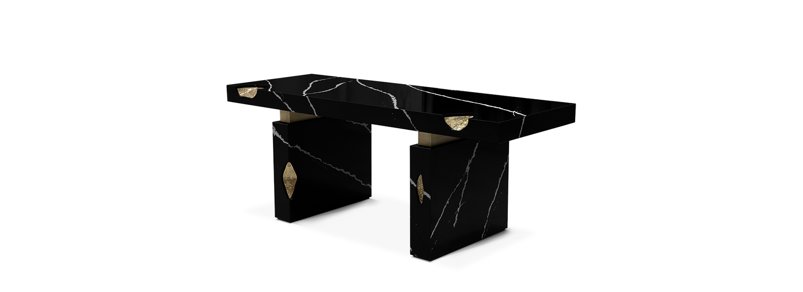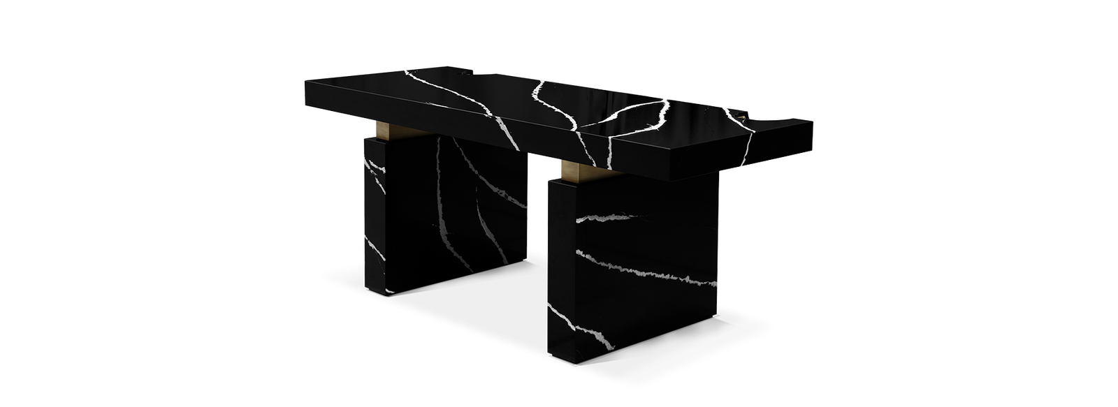 The Nougat desk is inspired by the shape and combination of coffee and chocolate, where the harmonious flavors combine perfectly for an overwhelming taste experience. Fulfilling your cravings for something rich, this high-end desk makes for a deluxe aesthetic the same way chocolate resonates with coffee. The cracks in aged brushed brass over the nero marquina marble in the top and legs, resemble the flavorful almonds emerging from the dark chocolate nougat. A desk to indulge in an elegant and modern office.