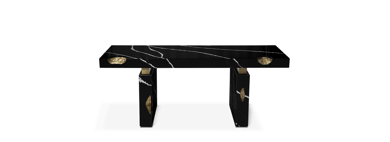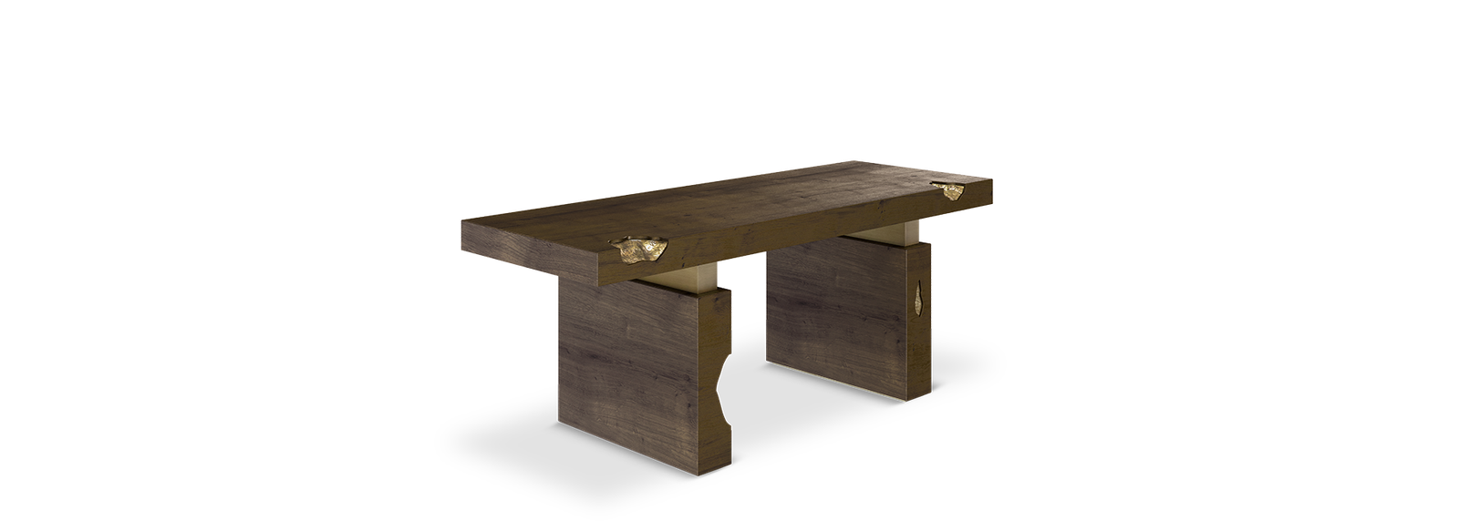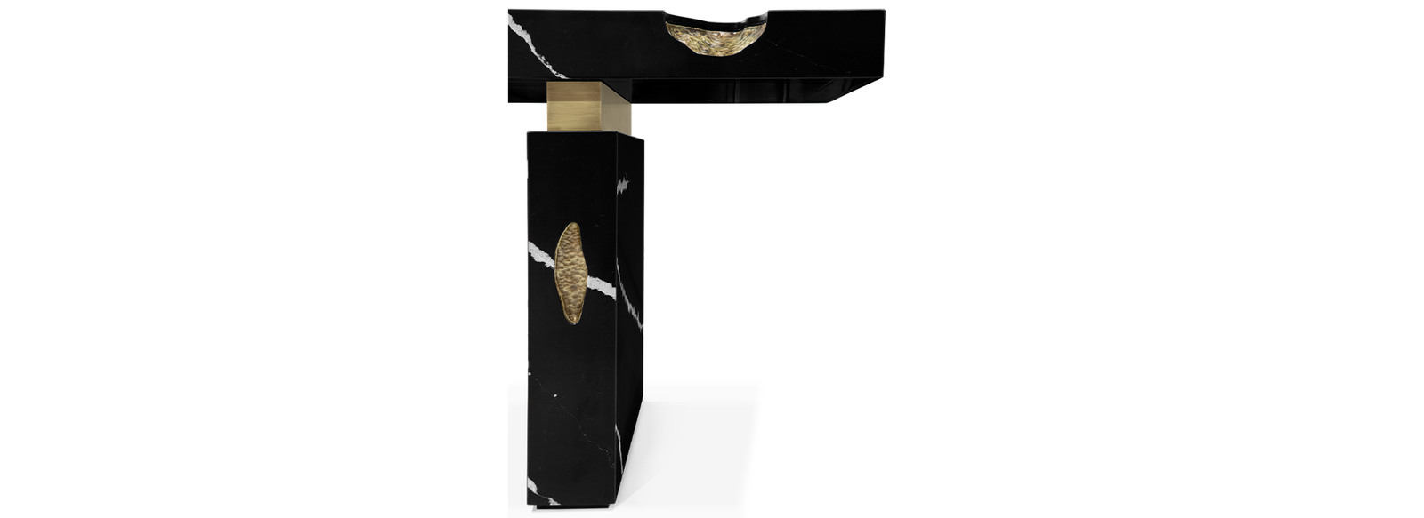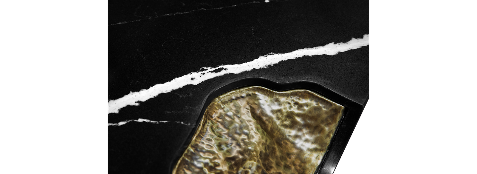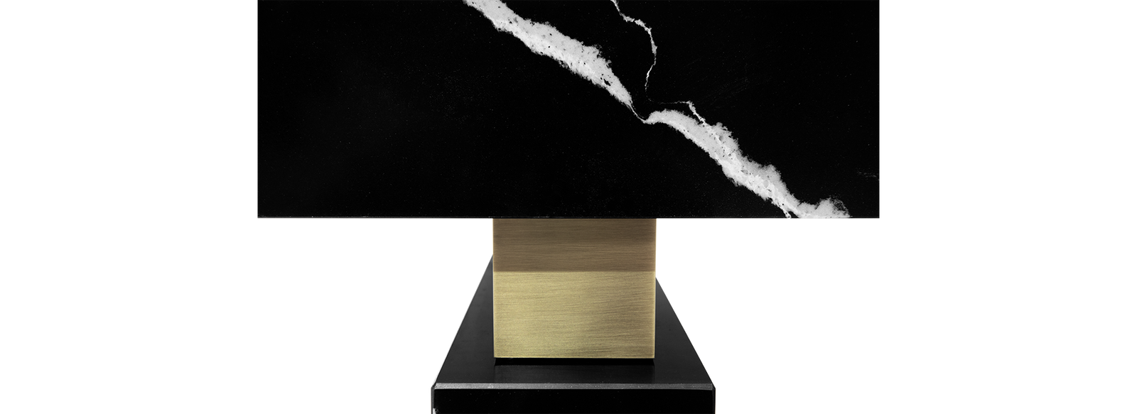 The Nougat desk is inspired by the shape and combination of coffee and chocolate, where the harmonious flavors combine perfectly for an overwhelming taste experience. Fulfilling your cravings for something rich, this high-end desk makes for a deluxe aesthetic the same way chocolate resonates with coffee. The cracks in aged brushed brass over the nero marquina marble in the top and legs, resemble the flavorful almonds emerging from the dark chocolate nougat. A desk to indulge in an elegant and modern office.