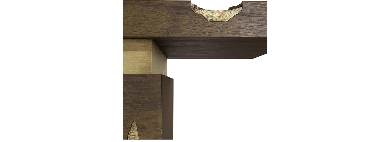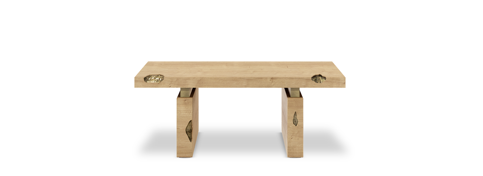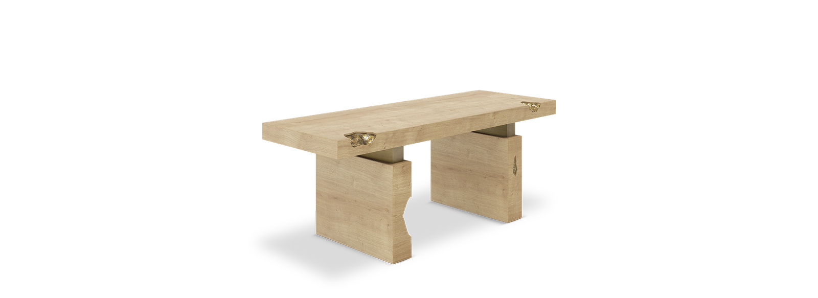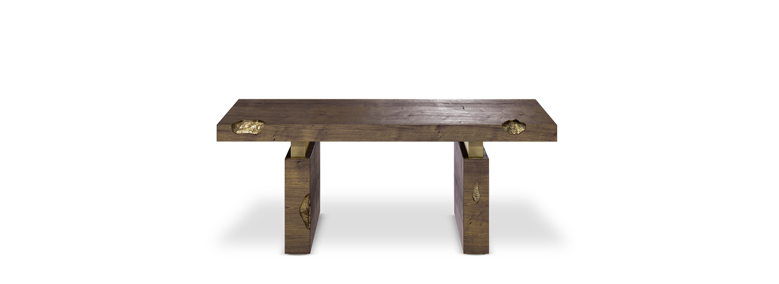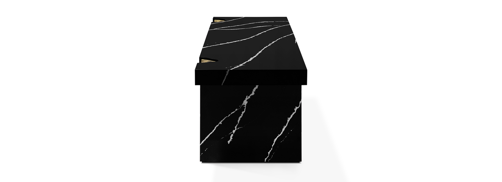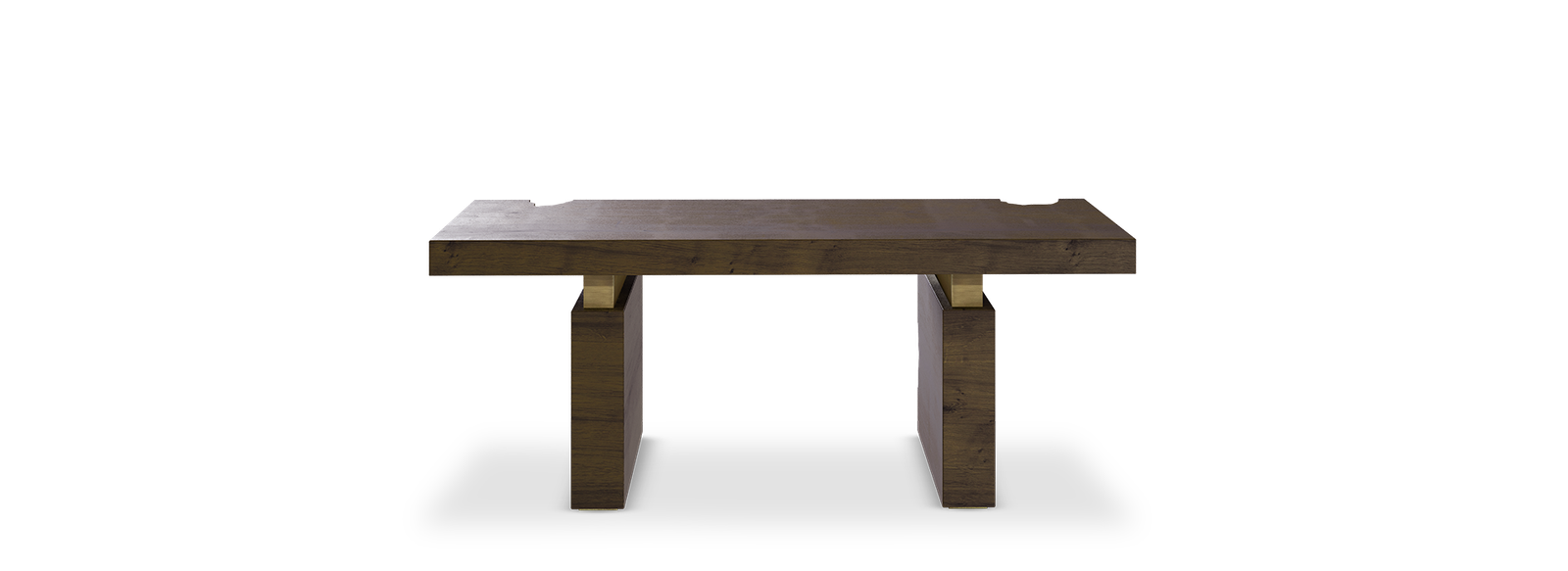 The Nougat desk is inspired by the shape and combination of coffee and chocolate, where the harmonious flavors combine perfectly for an overwhelming taste experience. Fulfilling your cravings for something rich, this high-end desk makes for a deluxe aesthetic the same way chocolate resonates with coffee. The cracks in aged brushed brass over the nero marquina marble in the top and legs, resemble the flavorful almonds emerging from the dark chocolate nougat. A desk to indulge in an elegant and modern office.