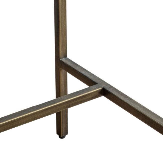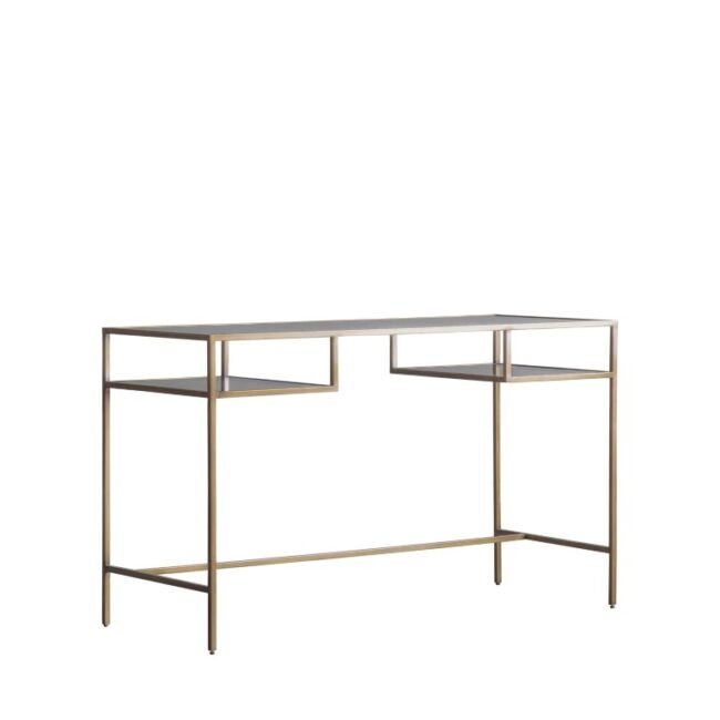 A sleek, engineered desk featuring a slender metal frame, in a bronze finish, paired with brown smoked glass to add a touch of glamour to a home office. The sophisticated design features two open storage shelves. It is also available in a silver finish.
