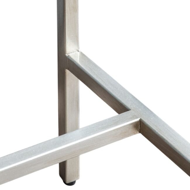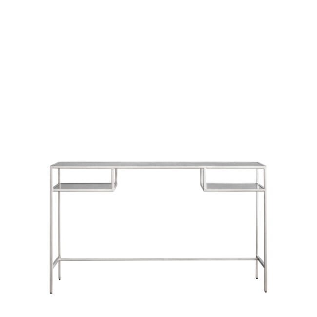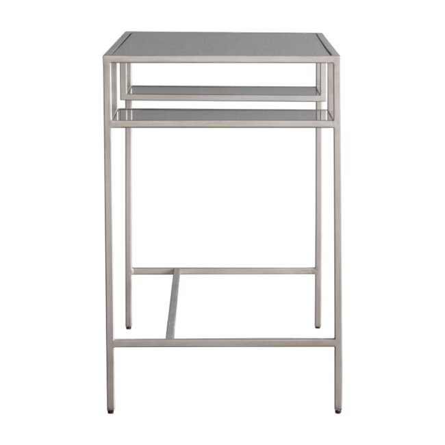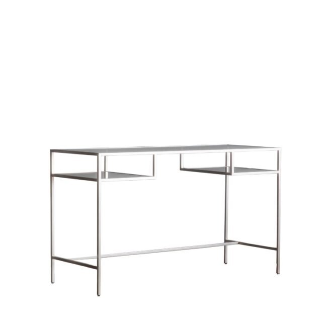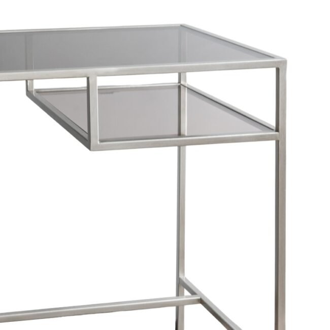 A sleek, engineered desk featuring a slender metal frame, in a stylish silver finish, which pairs beautifully with the brown smoked glass. Perfect for adding a touch of glamour to a home office, the sophisticated design features two open storage shelves. It is also available in a bronze finish.