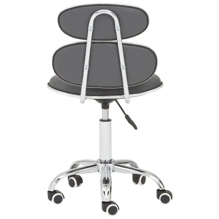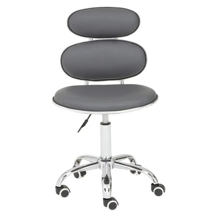 Featuring a minimalist profile, this Frannie Grey PU Home Office Chair with height adjusted mechanism will work well in any home or office space. Upholstered from grey PU, this chair features a pebble design seat with padded cushions for optimum support. The ergonomic seat rests on a swivel base with castor wheels offering swift maneuverability.