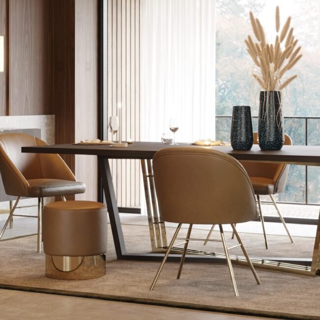 The Loren chair is perfect for intimate dining areas, upholstered in your preferred fabric and featuring sleek feet and modern lines. It creates a cosy and inviting atmosphere.