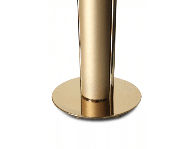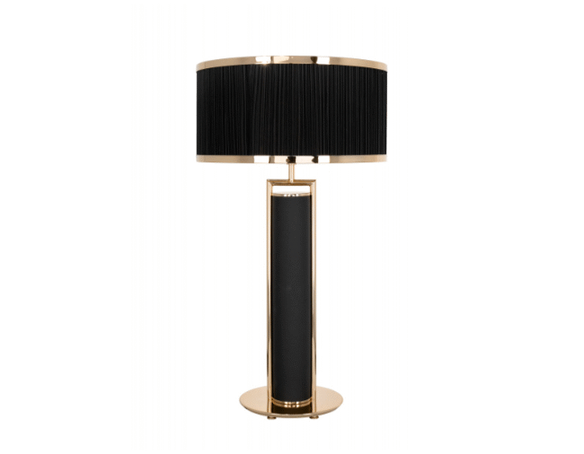 A structure framed by golden brass tubes and a wood base confer a harmonious balance to the piece. A simple yet sophisticated black lampshade conveys a luxurious and refined look that doesn’t go away unnoticed.