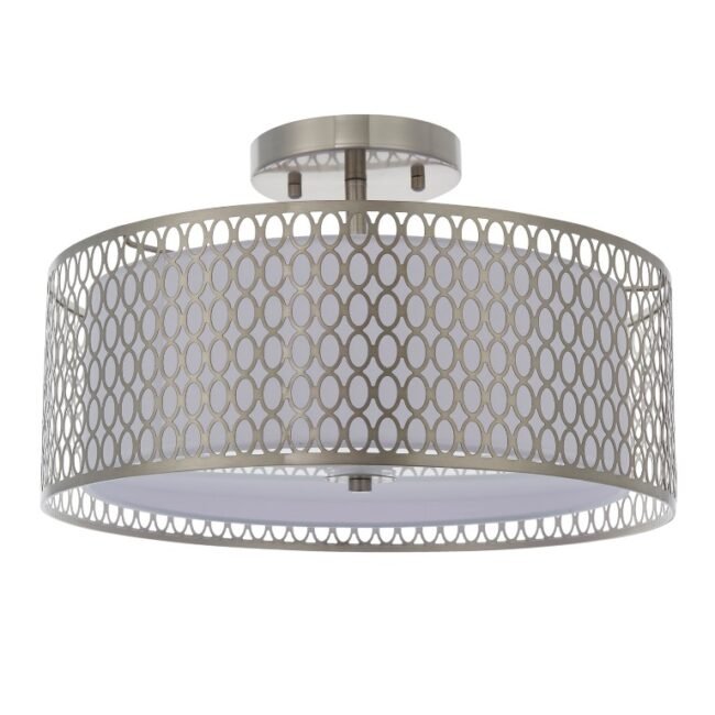No compromise on design for low ceilings. This is a classic circular light with a trendy geometric fretwork metal outer and an inner fabric shade for lovely light diffusion.