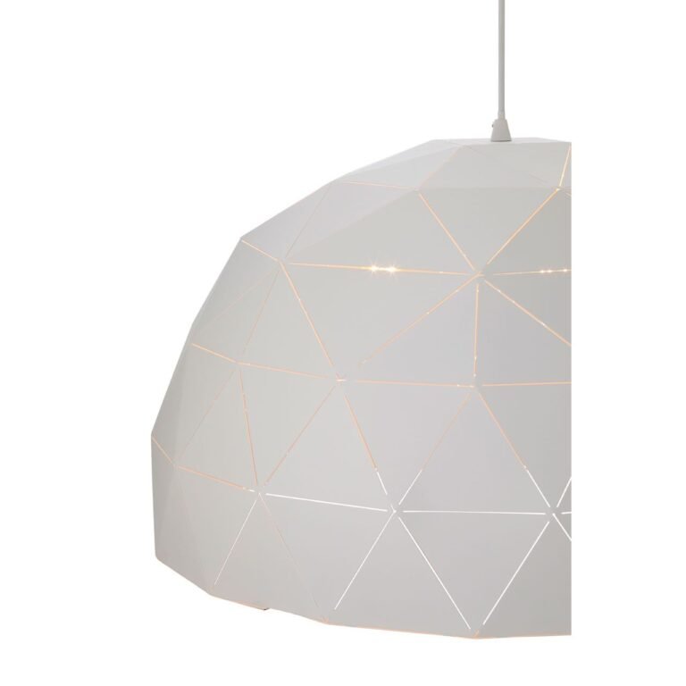 Eynsford Large White Dome Pendant Light: The shade is composed of a series of triangular forms made from tough steel. Slivers of space separate each segment, and when lit this allows small shards of light to escape. The crisp white finish and interior make it easy to coordinate with clean, monochromatic design themes. A simple white cord suspends the light from the ceiling.