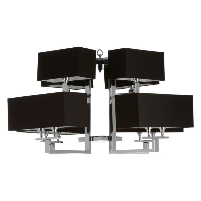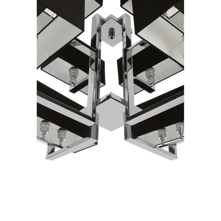 Hartel 12 Bulb Pendant Light: Crafted from stainless steel, this pendant light’s frame features a high gloss nickel finish which boasts gleaming metallic hues. Each light has an acrylic shade covered with black textured fabric contrasting the silver tones of the holding stand. Their square and rectangular shapes form a symmetric design aesthetic and the fabric helps them to cast an ambient glow.