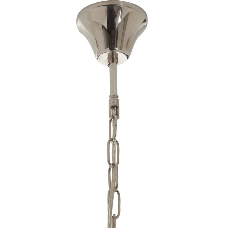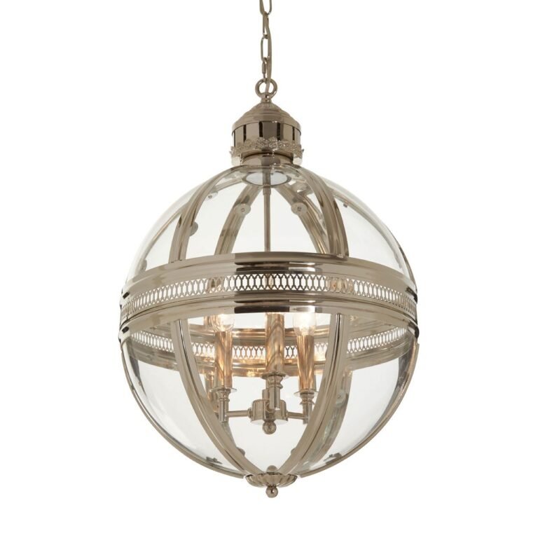 Kie Nickel Finish Pendant Light: The sphere is made from clear glass, enabling a full view of the four candlestick style lamps which are encased within. Bands of iron swell across its surface, coordinating with the metal grille which bands its circumference. Intricate details, such as the rococo motifs which decorate its hood, evoke traditional design, while its reflective nickel finish lend it a contemporary look.