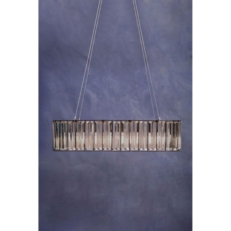 Its frame is made from slender bands of sleek iron and is coloured black to counterpoint the clear glass. The Kiko 4 Bulb Pendant Light long oval shape means that it disperses the light widely, making it suited to displaying above a dining table or kitchen bar. Each strip of glass has beveled edges that refract the light from the four bulbs when lit.