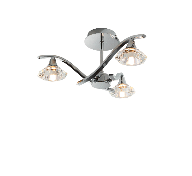 This 3 light semi flush is finished in chrome effect with clear crystal shades. This fitting is dimmable and suitable for use with LED lamps. Other finishes and ceiling, wall, table and floor options also available.