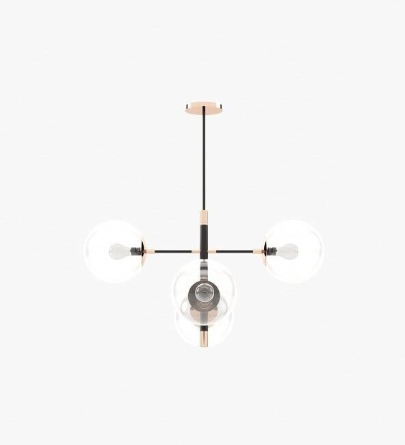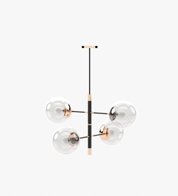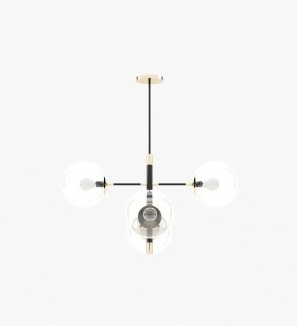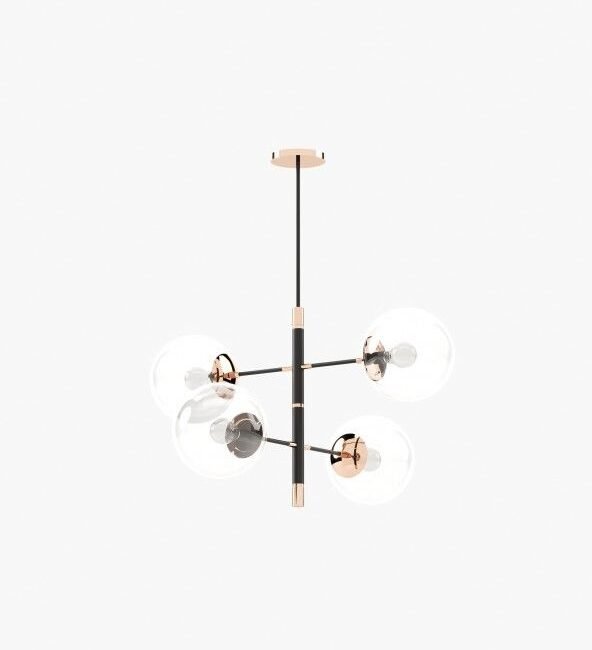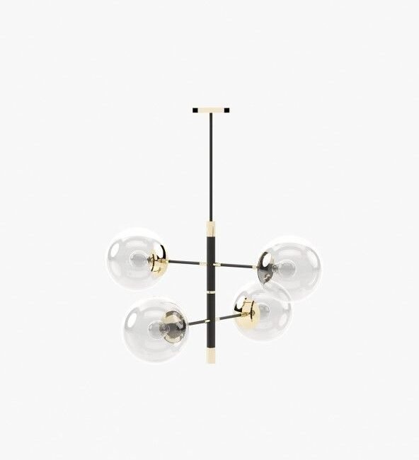 The Meredith suspension lamp is a glamorous handmade piece with a metallic structure and details. It features two levels of lighting, each with two bulbs pointing in different directions, providing ample light for your dining room.