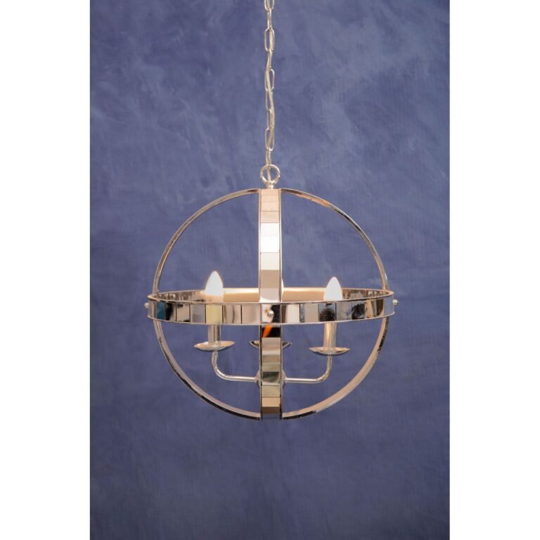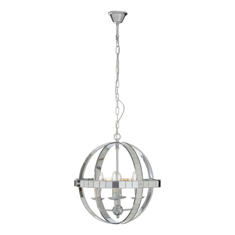 Regents Townhouse Rounded Pendant Light: Two intersecting lines of polished tiled iron are fixed to the clear glass orb like gyroscopic gimbals. A third line crosses its central section, separated from the glass by chrome bolts. Inside the orb, four candle design lights are mounted on steel pillars with round bobeche detailing. A matching iron chain suspends it from the ceiling.