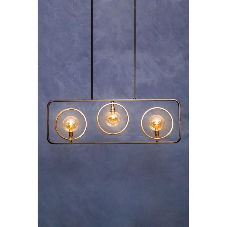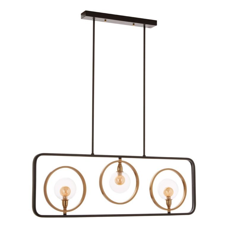 The Tabira 3 Bulb Pendant Lamp features a durable iron frame with a stylish metallic bronze finish. Its design includes gracefully curved corners that complement the trio of circles, each holding an exposed bulb for a modern touch. The lamp is securely mounted to the ceiling with two iron poles, ensuring stability and adding an industrial chic aesthetic to any space. Perfect for enhancing the ambiance of living rooms, dining areas, or kitchens, this pendant lamp combines robustness with contemporary elegance, making it a standout piece in home lighting design.