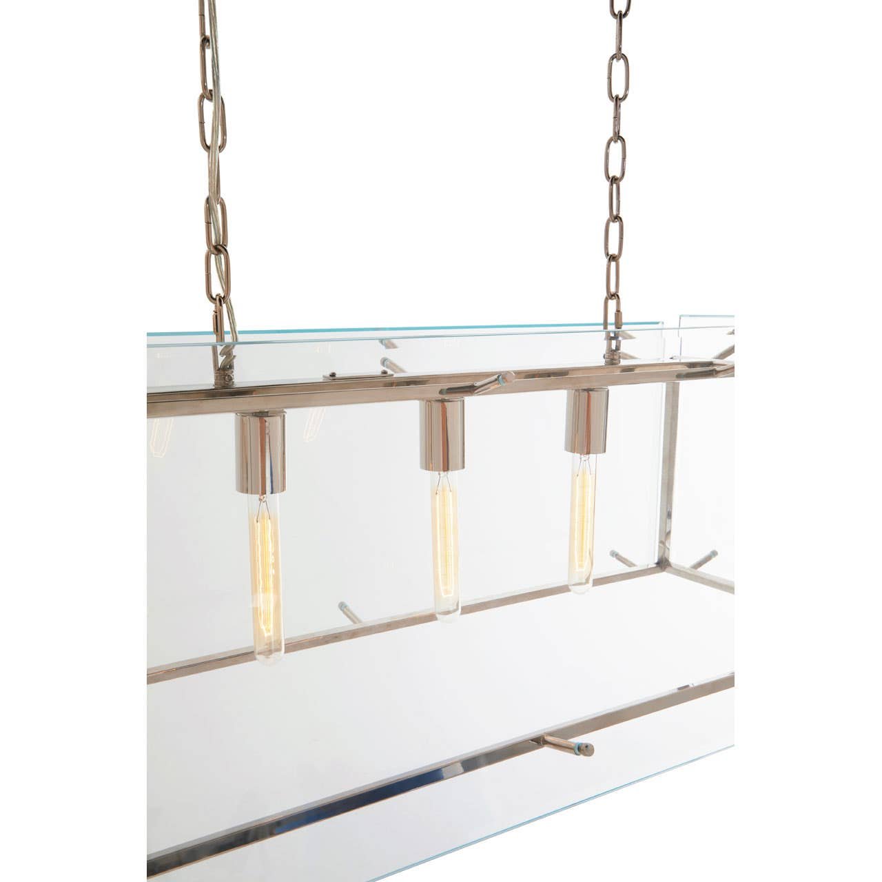 Alazzo Nickel Finish Pendant Light: With a nickel finish metal structure encased in a clear glass frame, this pendant light features an angular shape ideal for subtly industrial abodes and urban lofts. The light has three bulbs providing ample downward lighting on the surface.