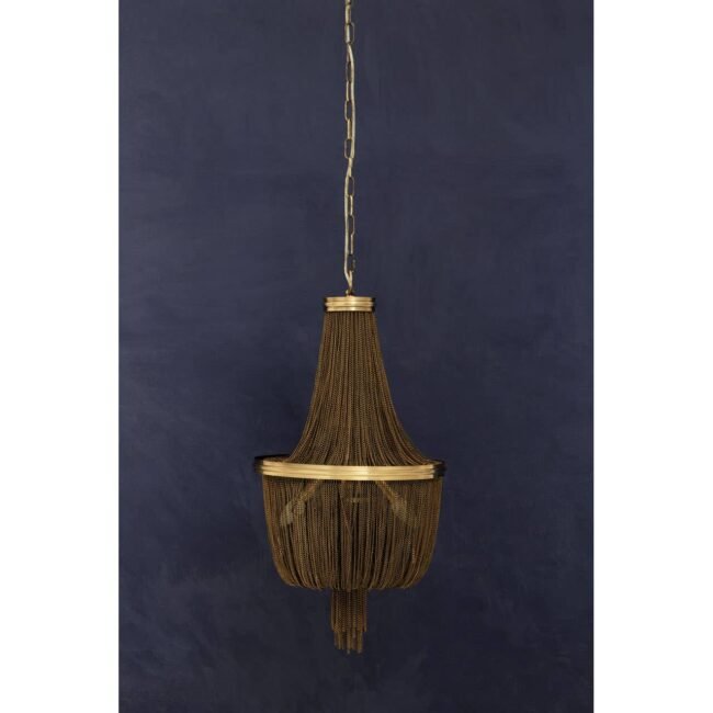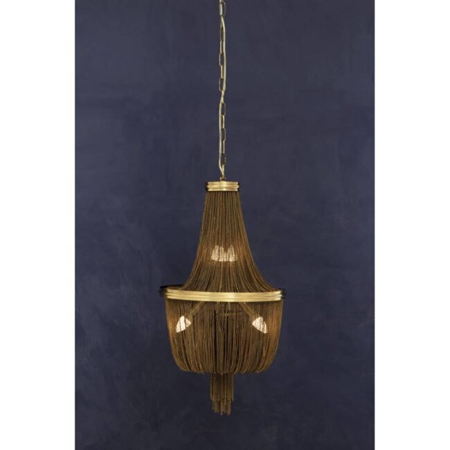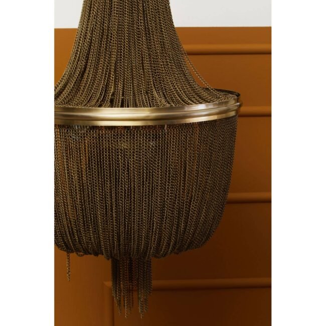 The Chain Era chandelier brings timeless elegance and sophisticated ambience to the dining room. Complete with six bulbs in the frame, this piece exhibits a warm glow in the living area with its gathered veils of metal chains in antique brass finish.