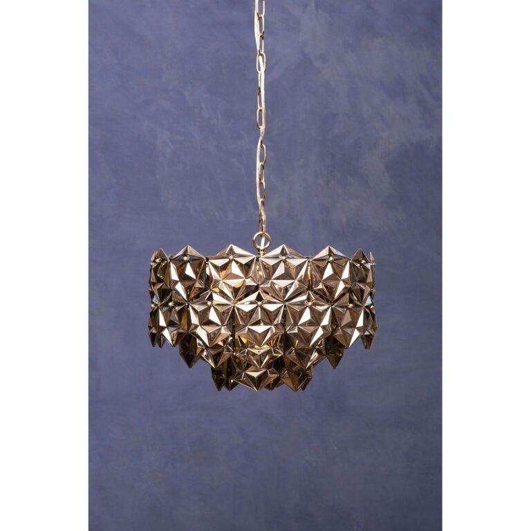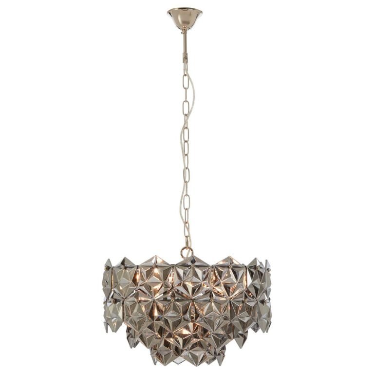 Dello Smoked Grey Glass Chandelier: Formed from smoked grey glass, the distinctive Dello chandelier boasts a multifaceted geometric shade that refracts light to create an ambient glow.