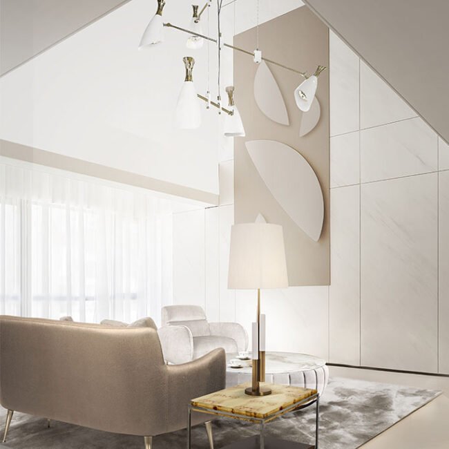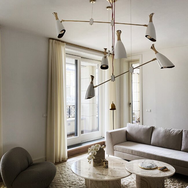 DUKE PENDANT SUSPENSION: Duke is a modern pendant lighting design that boasts a heavy nostalgic 70s groove vibe. Inspired by the simplicity of the 1970s, DelightFULL’s designers were able to create an iconic modern ceiling light that suits the most demanding setting. Produced in Portugal, it is handmade in brass and aluminum. The body, made of brass, has both a matte black and a gold-plated finish, while the shades are lacquered a glossy black on the outside. The inside is matte white, but it can also have a gold powder paint finish. It is a stunning bedroom ceiling light, but this large ceiling light can also be considered for other settings, such as a mid-century modern living room.