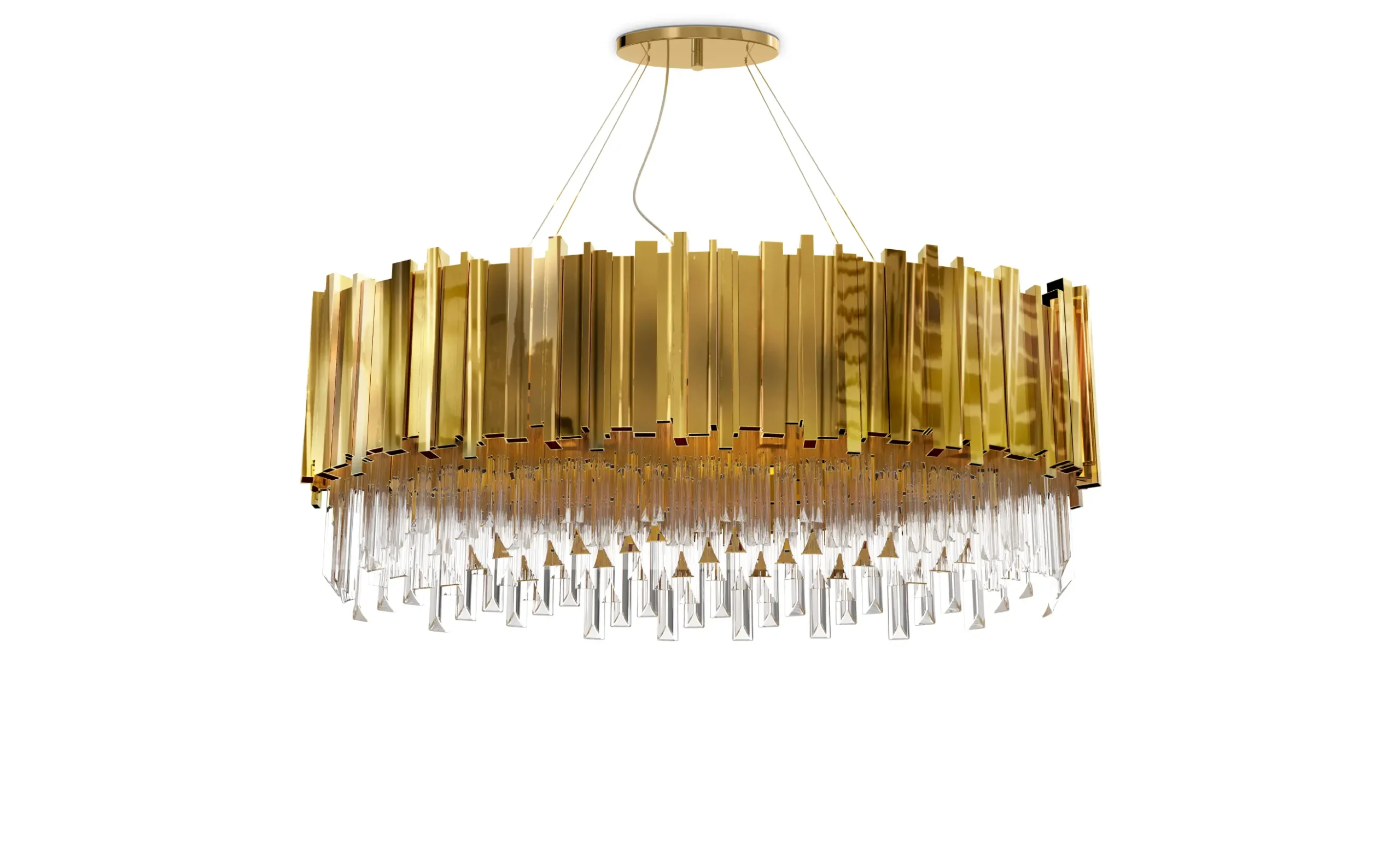 The Empire Oval Suspension Lamp takes the iconic lines from LUXXU’s most renowned collection in a new shape. This suspended light combines flawlessly classic and modern design with refined materials such as gold-plated brass and crystal glass.