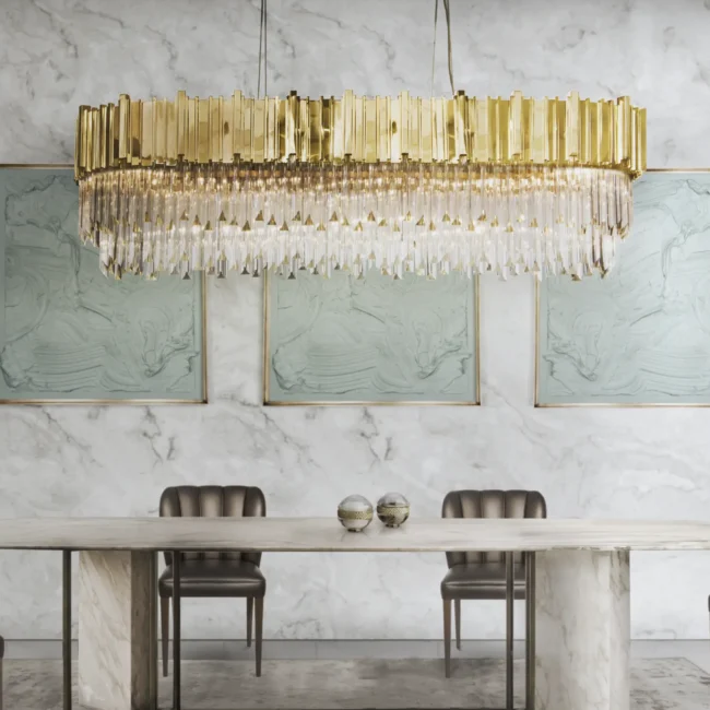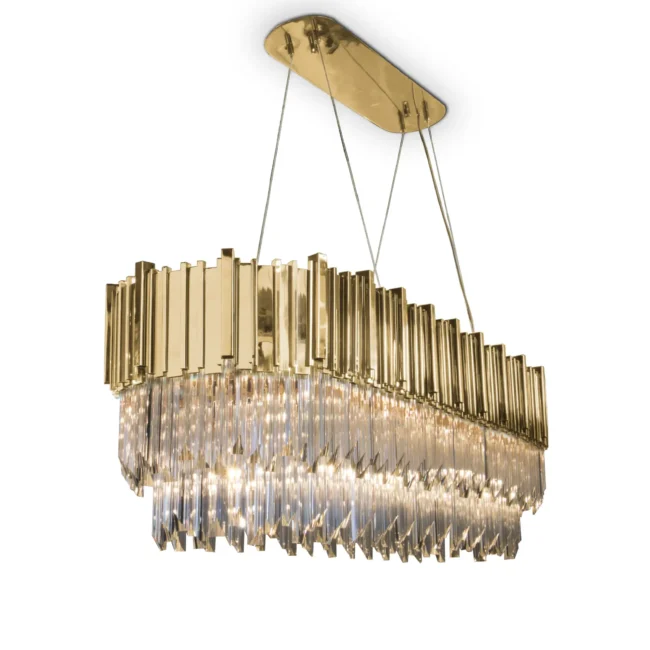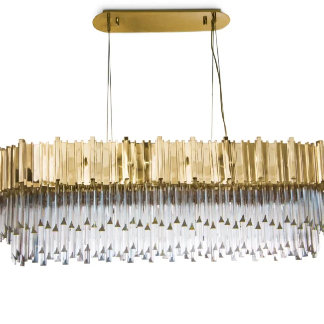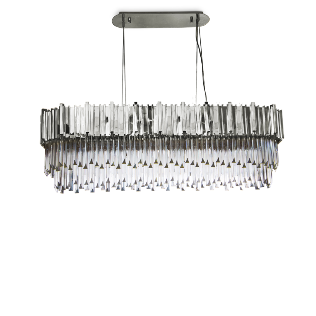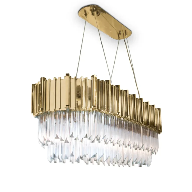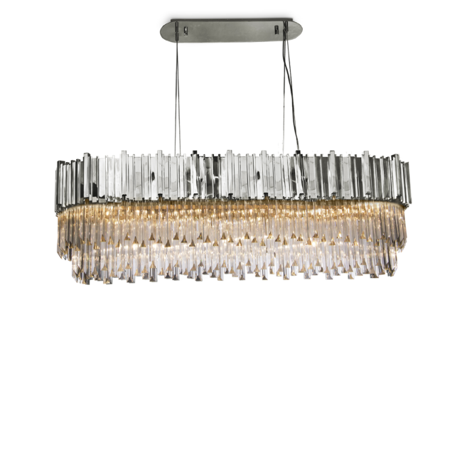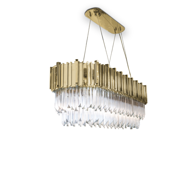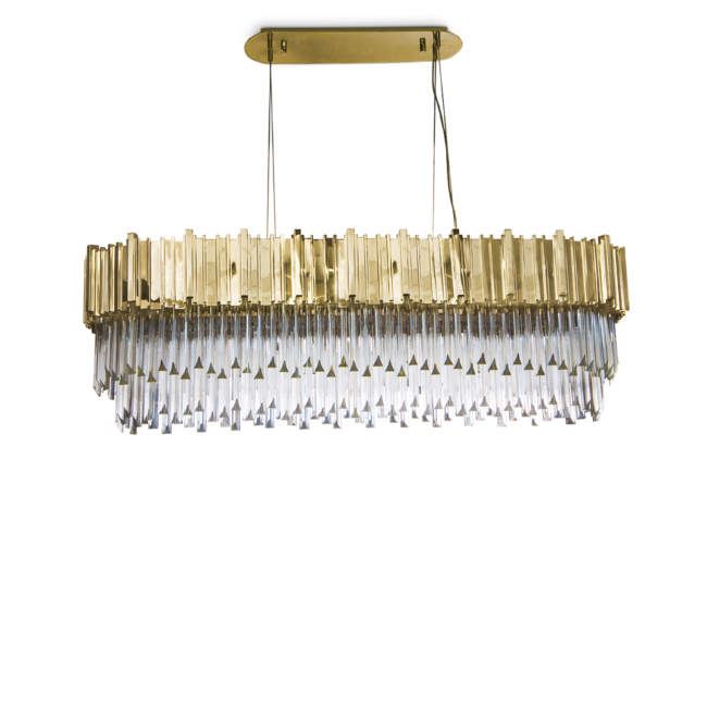 Created with crystal glass and gold-plated brass, this magnificent suspension lamp is capable of giving a luxurious and glamorous look to any space. The Empire Snooker Suspension Lamp is a jewelry piece for any interior, creating a sophisticated and unique atmosphere. Perfect for modern dining rooms or to place above billiard tables.MATERIALS