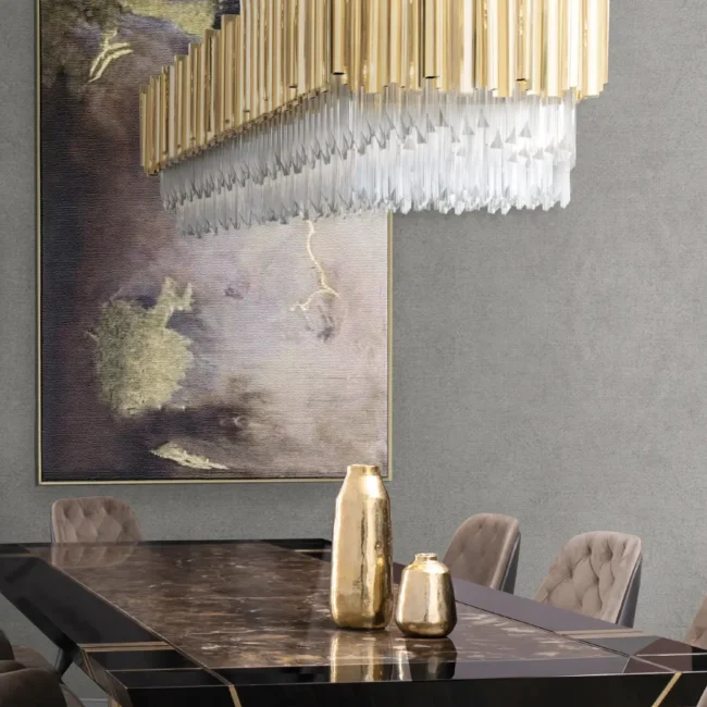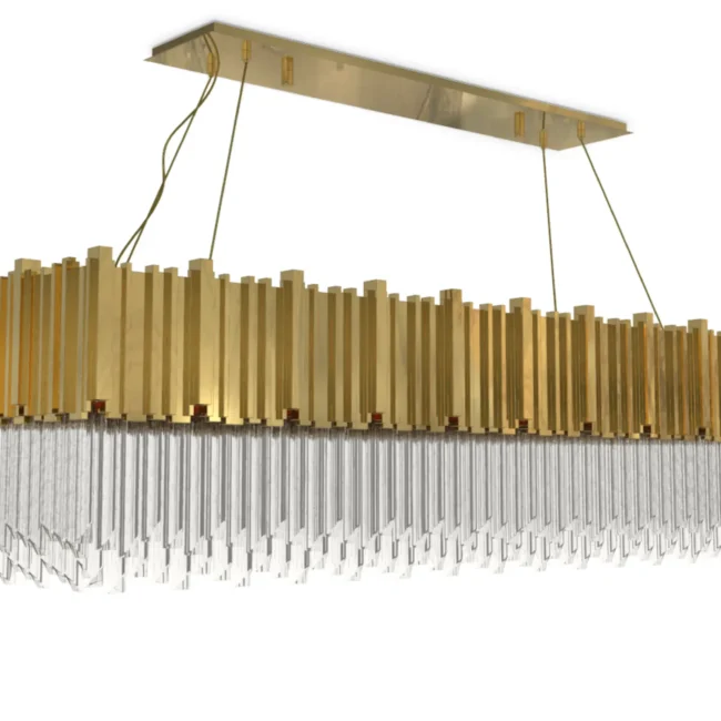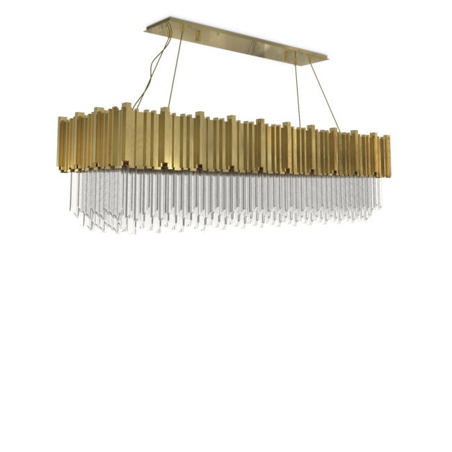 The iconic lines of the Empire Collection have inspired this modern snooker lamp. A glamorous and extravagant, yet charming, lighting fixture that combines modern lines with a classic feel. Made of gold-plated brass and vintage-inspired crystal glass, its design is perfect for dining rooms or billiard tables.MATERIALS