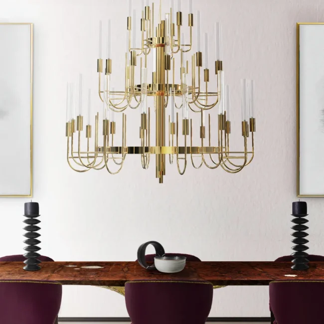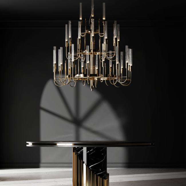 Designed from the soft blend of emotional yet beautiful lines the Gala Suspension is the perfect outcome of brass and crystal glass. A superb piece for timeless creations.