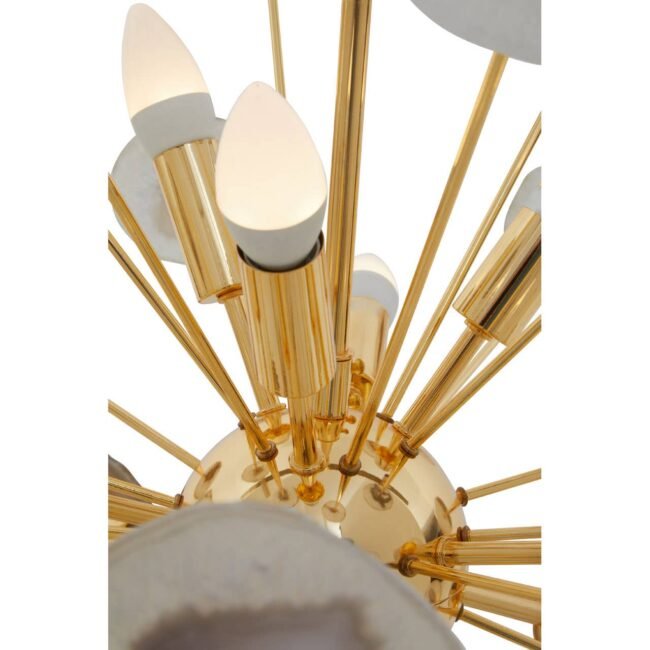 Glamira Twelve Bulb Pendant Light: Intricately handcrafted, this contemporary pendant light brings radiance and an organic charm to the living area. Creating a chic statement, the sphere design metal frame features several discs of agate neatly adjusted in front of twelve bulbs.