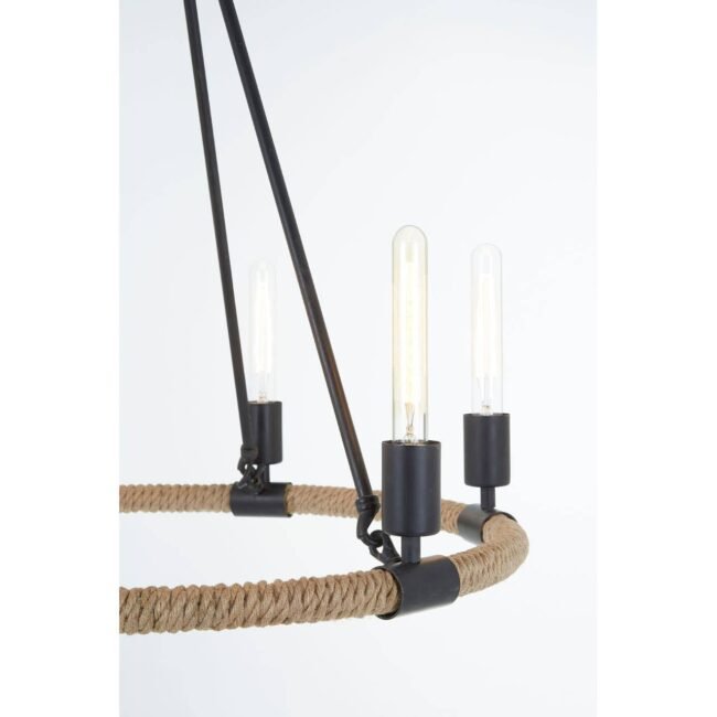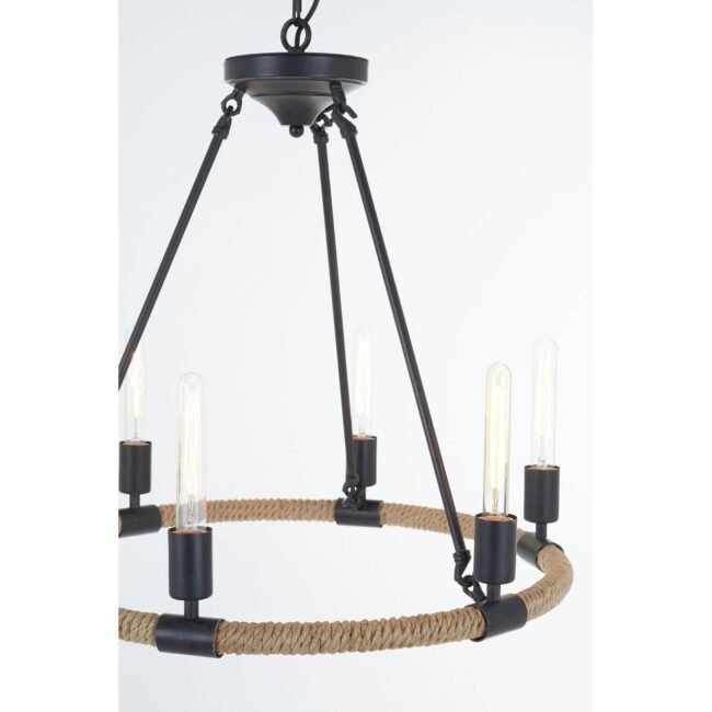This Kie 6 Bulb Chandelier’s golden rope base is juxtaposed with the antique black ironwork above.