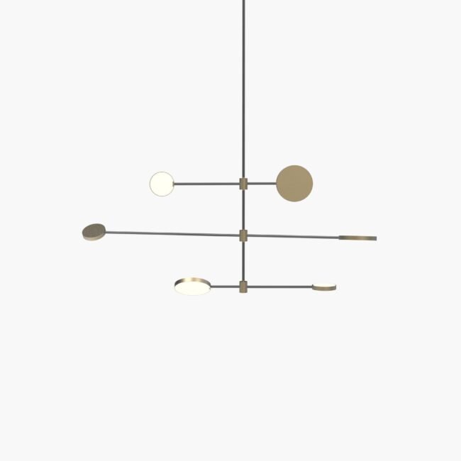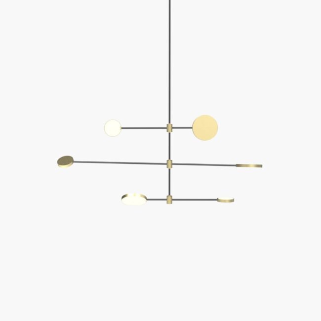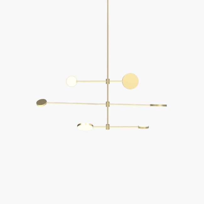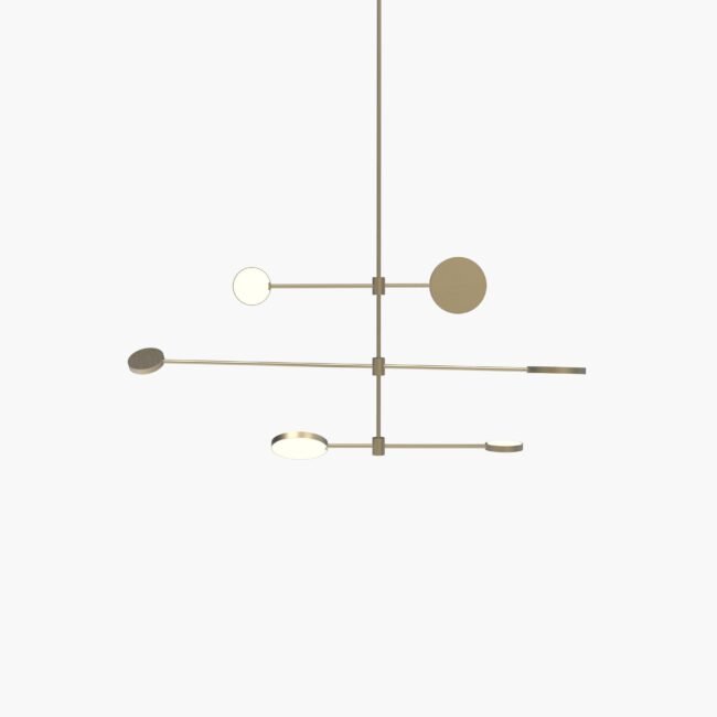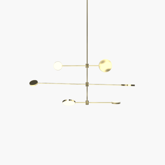Metal rods hang at opposing angles, balanced by illuminated brass discs. Machined from solid aluminium and brass.