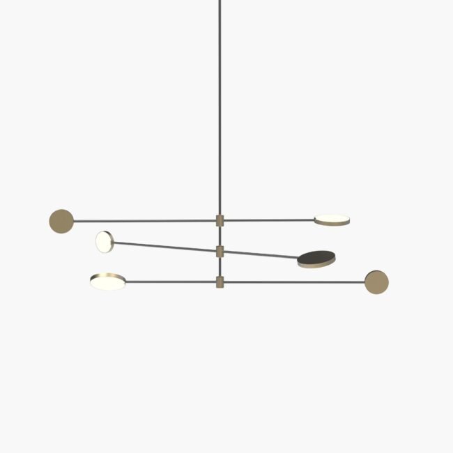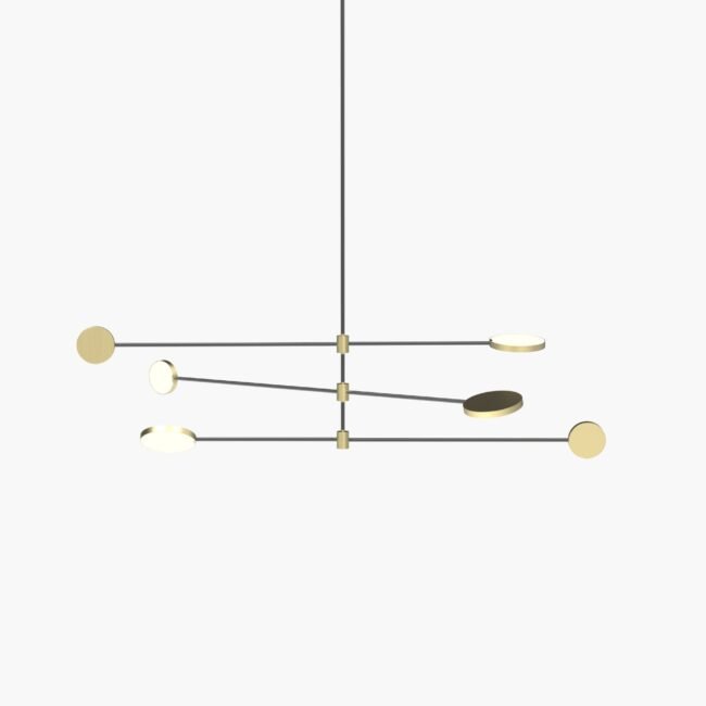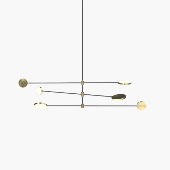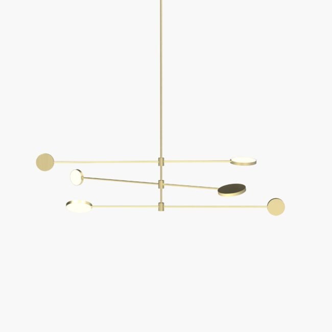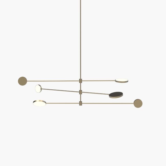 Metal rods hang at opposing angles, balanced by illuminated brass discs. Machined from solid aluminium and brass.