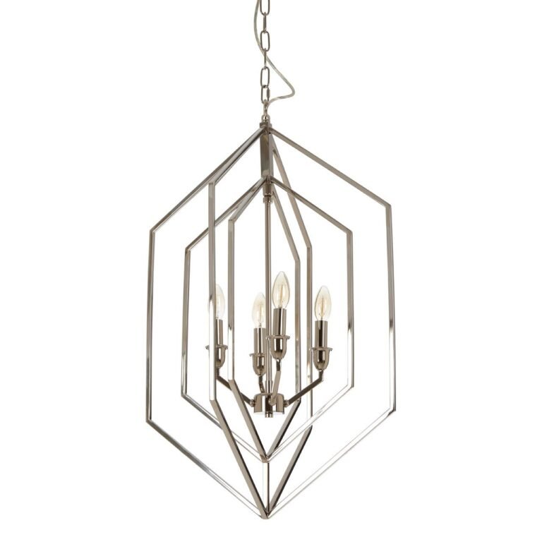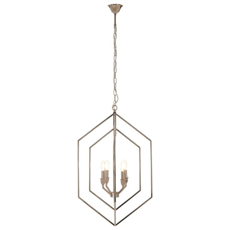 Oakridge Hexagonal Chandelier: Four candle-style light fixtures are housed within a hexagonal stainless steel frame, with a metallic nickel-plating adding an essence of luxe.