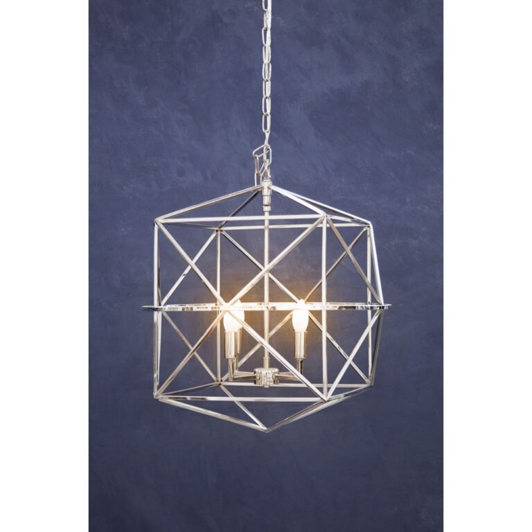 Pendle Hexagonal Chandelier: Four candle-style light fixtures are housed within a modern geometric frame formed from durable stainless steel, with a nickel plating lending it metallic appeal.